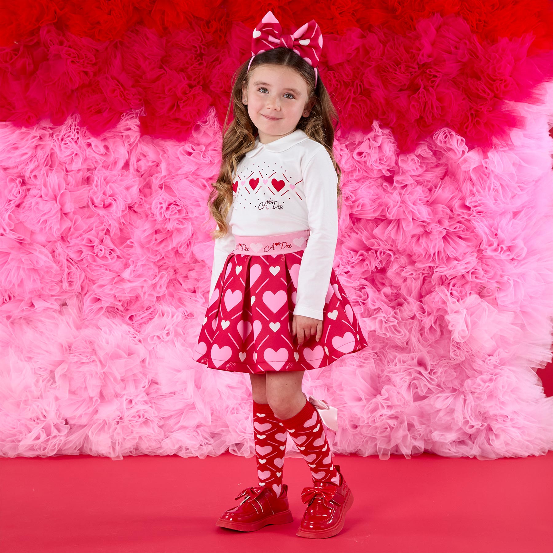 A Dee Love Story collection.  The iconic Lyla skirt set comes with a box pleat 'Love Story' heart printed skirt featuring an elastic waistband for a comfortable fit.  Paired with a long sleeved collared top with a pretty artwork - available in two colourways.  This set is just what an A Dee girl needs this season. Very easy and comfortable to wear.  Suitable for any occasion.