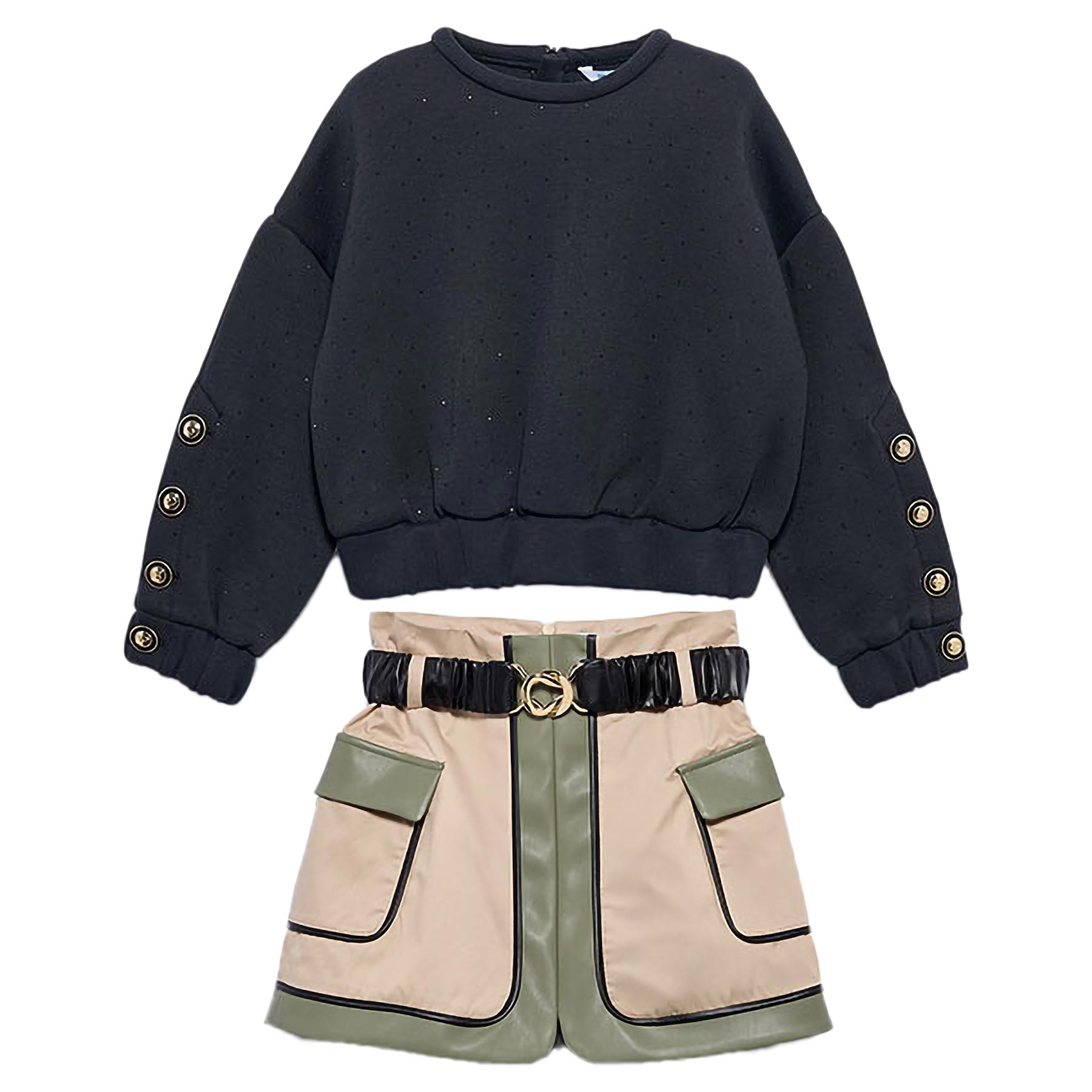 Abel & Lula - stylish sparkle jersey sweater and skirt set. Cotton jersey sweater with rolled edge neck, cuffs and waistband with contrasting embossed heart buttons in gold on the sleeves - fabulous sparkle all over and concealed zip at the back - comes with twill and faux leather skirt with covered elastic belt with gold buckle. Smart or casual - this set fits all occasions. Sizes are good for the ages.