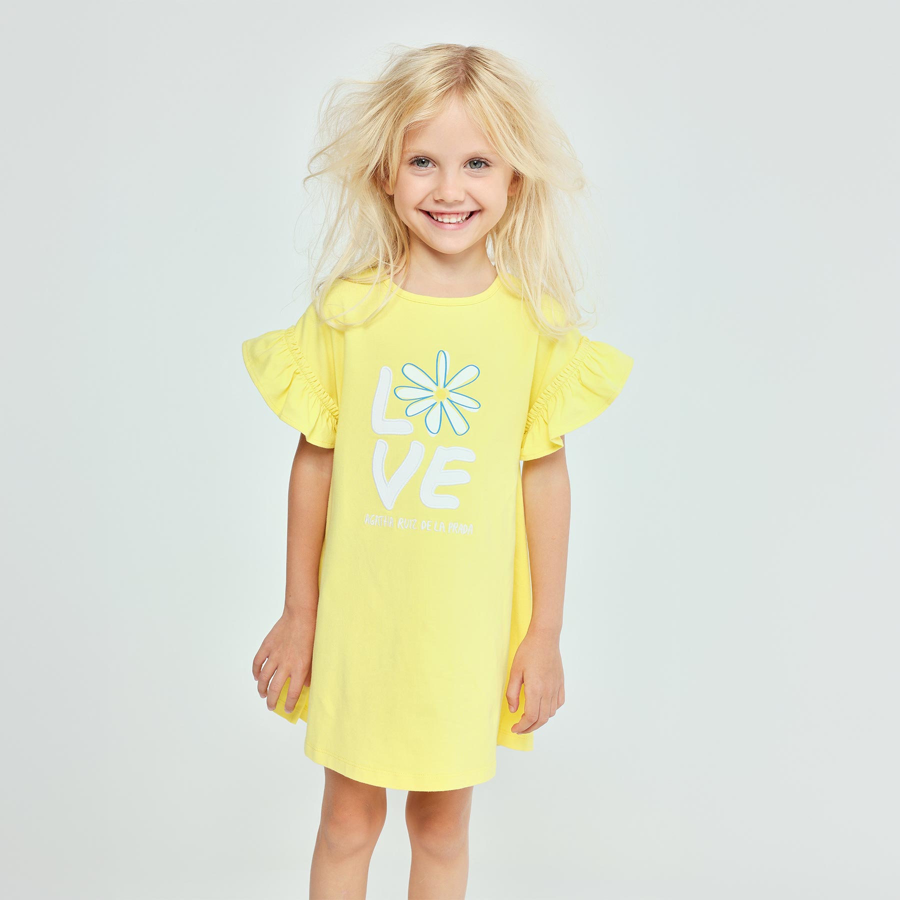 Agatha Ruiz De La Prada Collection loose fitting dress. Cotton jersey dress with daisy applique and print front and Agatha logo poppers at the back of the neck for easy dressing. Matching legging and shorts sets also available. This fun summer dress for girls is by Agatha Ruiz de la Prada.