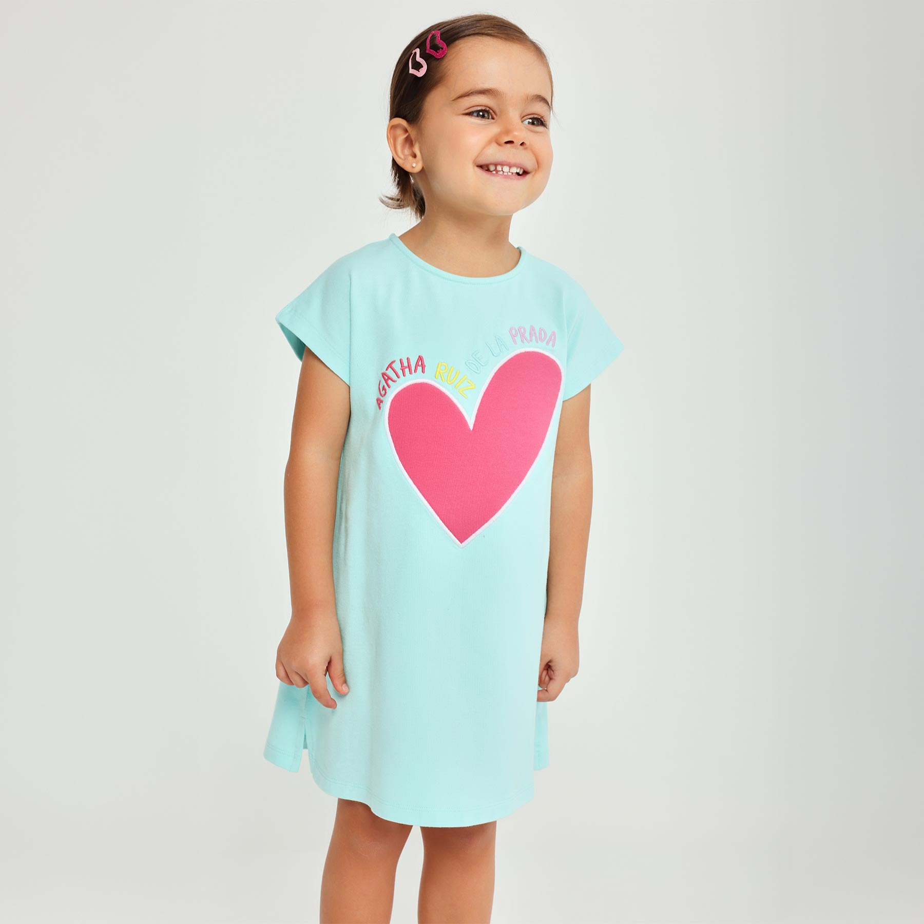Agatha Ruiz De La Prada Collection loose fitting dress. Cotton jersey dress with Agatha heart logo applique on the front - and Agatha logo poppers at the back of the neck.  Matching legging and shorts sets also available. This fun summer dress for girls is by Agatha Ruiz de la Prada.