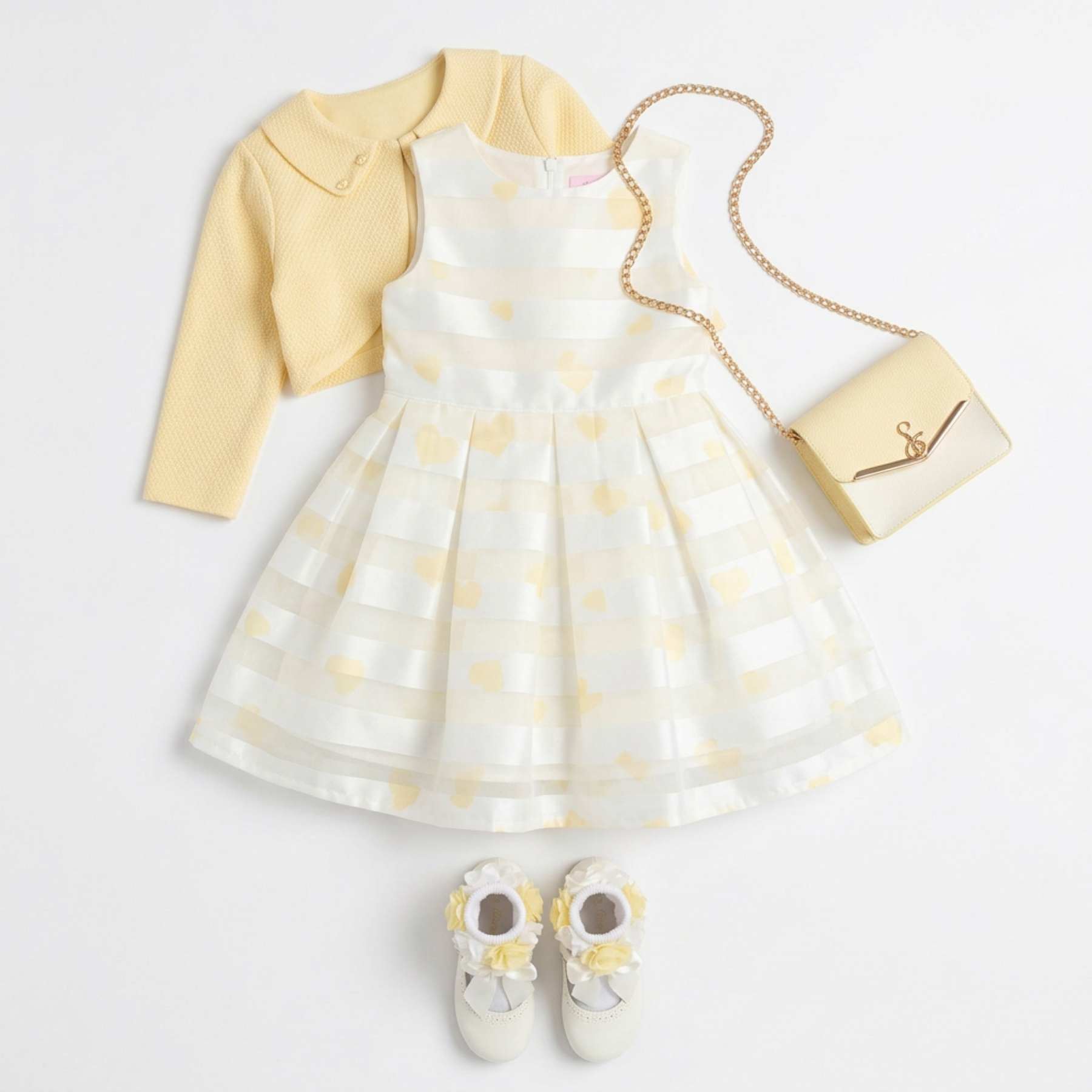 Beau KiD  girls gorgeous cap sleeve organza heart print dress with full skirt - lined with petticoat - with matching lemon jacket with collar and crossbody handbag - perfect for any occasion.   Available in sizes 1-2 years to 6-7 years.