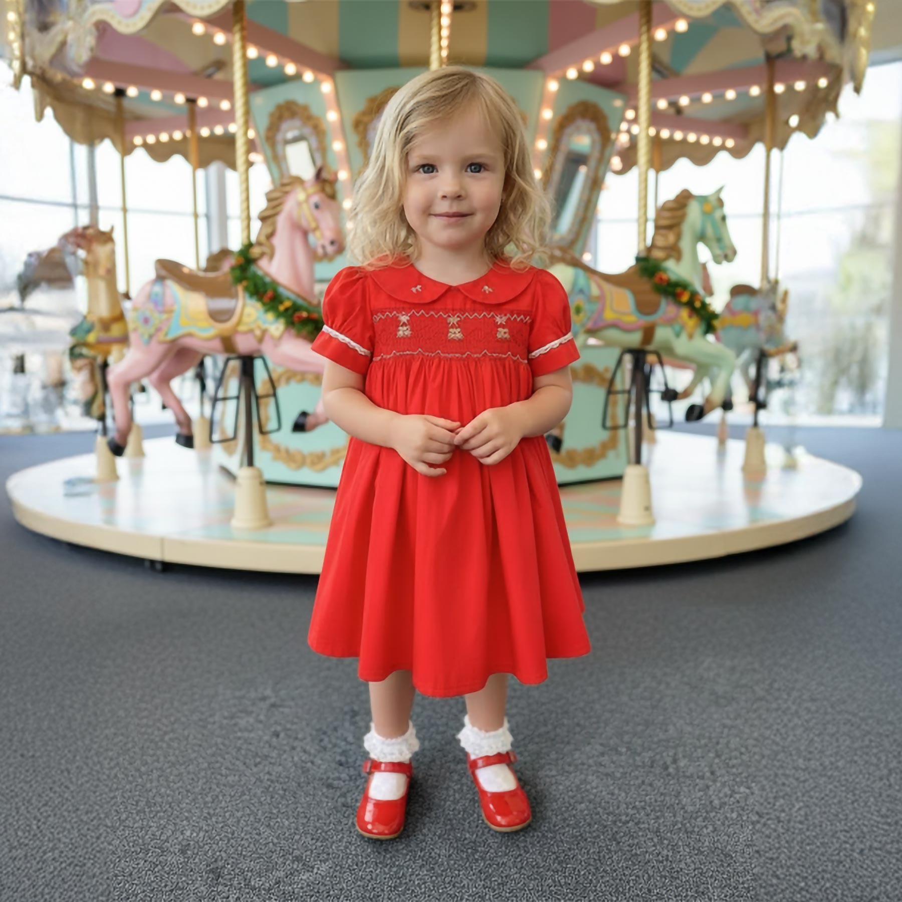 Beau KiD Girls Summer Smocked Bodice Puff Sleeve Dress - Red