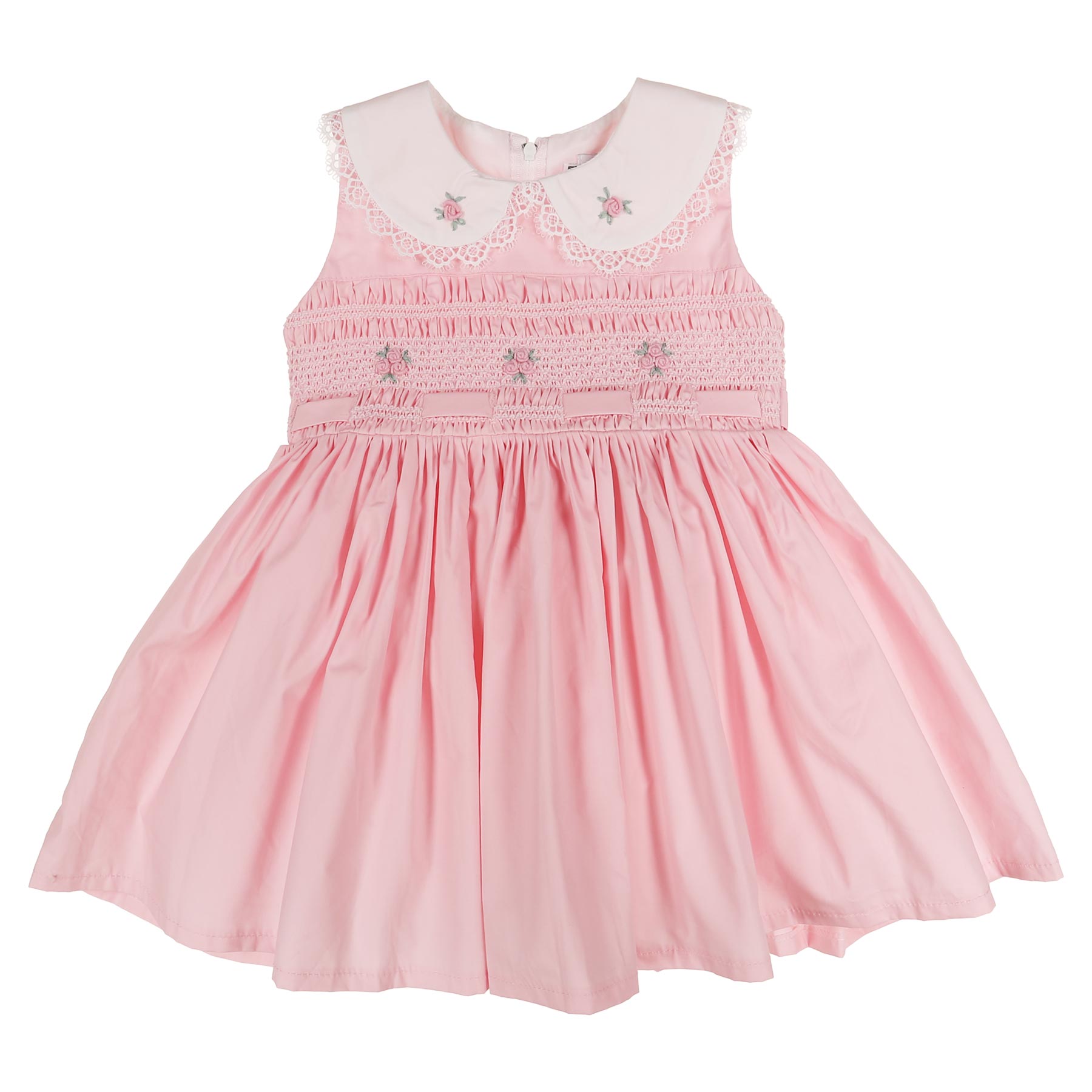 Beau KiD girls pretty poplin cotton sleeveless dress with smocked bodice with embroidered roses, peter pan collar edged with lace and embroidered roses, very full skirt with stiff tulle underskirt.  Concealed zip at the back and a large fixed bow. Available in several colours.