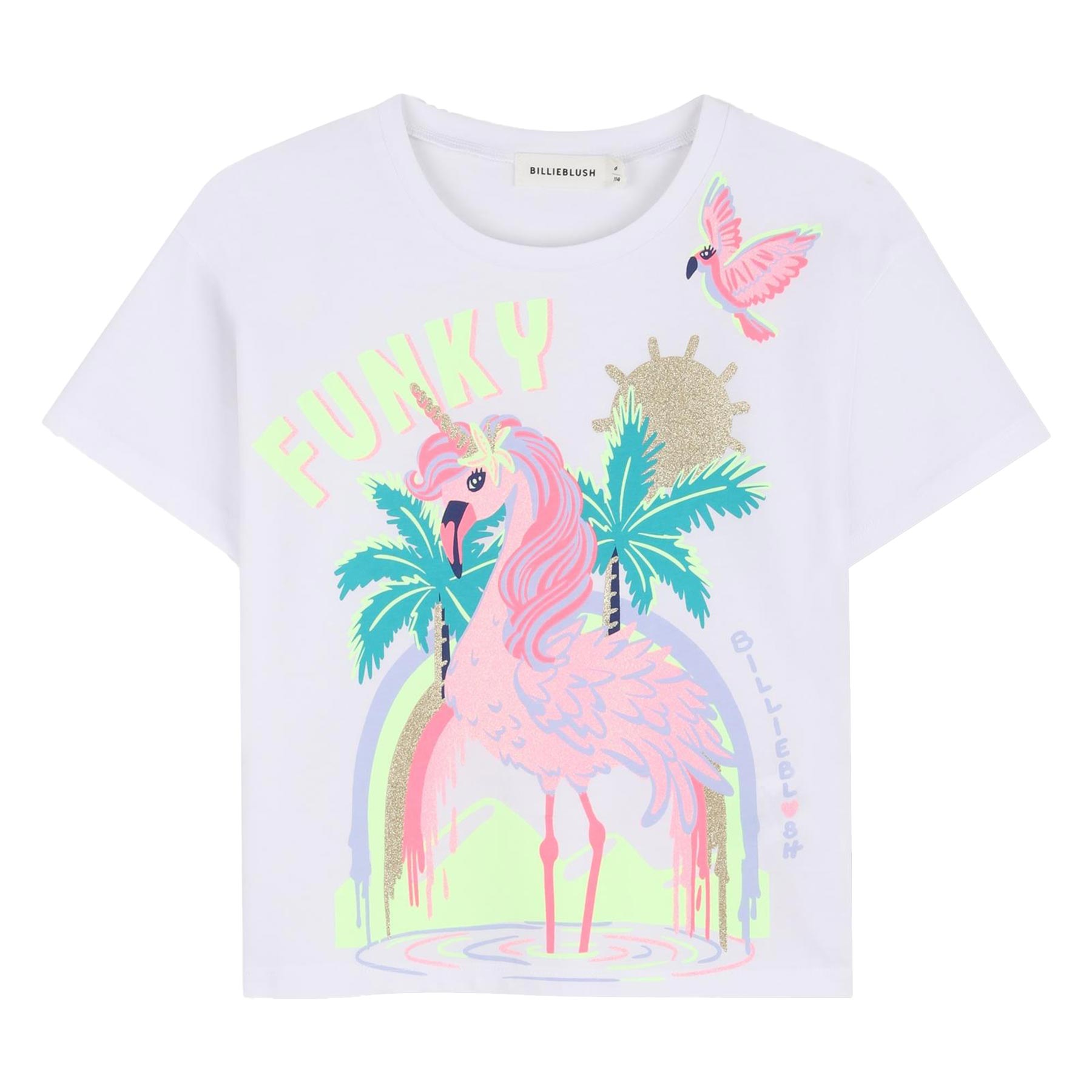 Billie Blush Girls Summer collection. Cotton jersey top - with fabulous multicoloured Funky Creature print on the front with glitter. Easy to fit and fun to wear - bright and stunning on. Perfect for wearing with other Billie Blush outfits to create a different outfit.