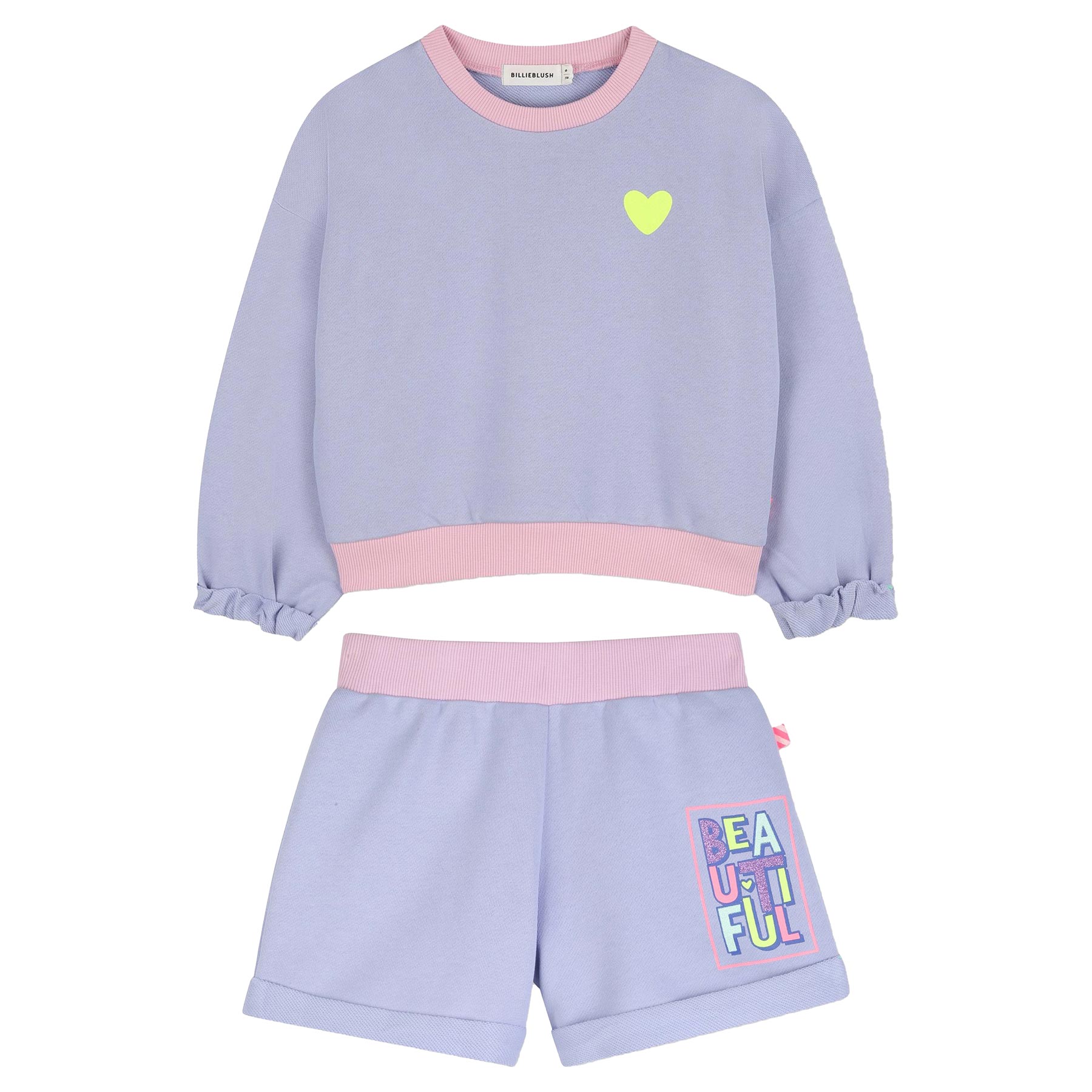 Billie Blush Girls Summer collection. Cotton jersey sweatshirt and shorts set - with fabulous 'Beautiful' multicoloured print on the back and also on the shorts. Pink and Lilac combination sweatshirt with bold print on the back and elasticated cuffs. Easy to fit and fun to wear - bright and stunning on. Perfect summer holiday outfit.
