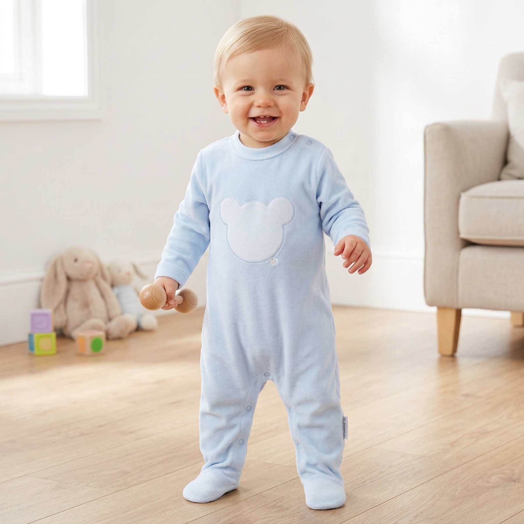 Blues Baby unisex soft velour babygrow in pale blue with super cute Teddy applique with pearl charm on the front and also on the bottom.   Loose fitting body.  Poppers up the back and between the legs.  Soft and comfortable for your little one.  Blues Baby is the perfect brand to give for Baby Showers and New Baby gifts.  The fittings are generous - always good to know.