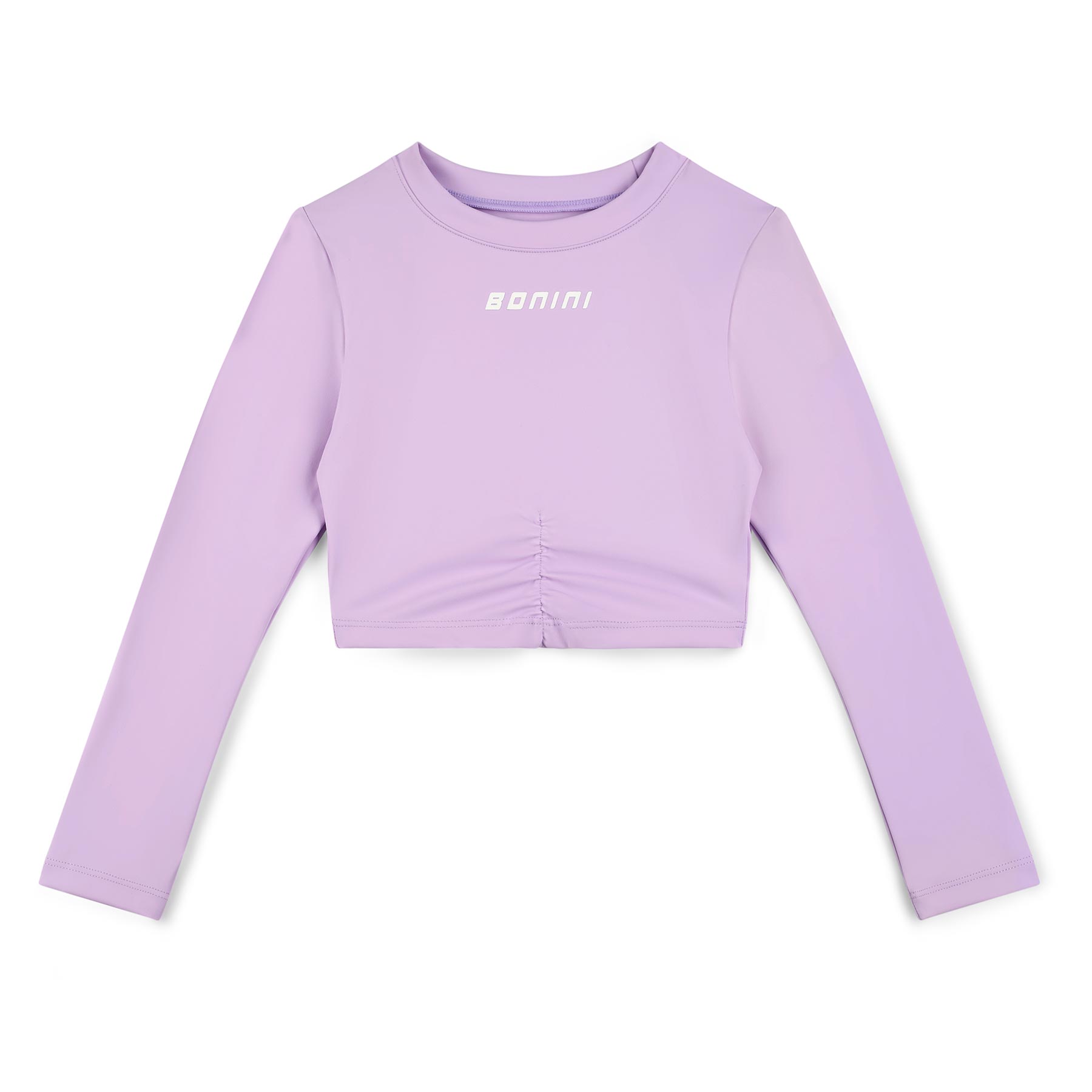 Bonini by A* Dee Leisure collection. The Aspire long sleeve crop top features a printed artwork logo and ruched detail on the front.  Ideal for active or casual wear. Can be worn with other items in this collection. Lots of matching accessories in this collection.  Available in other colours.