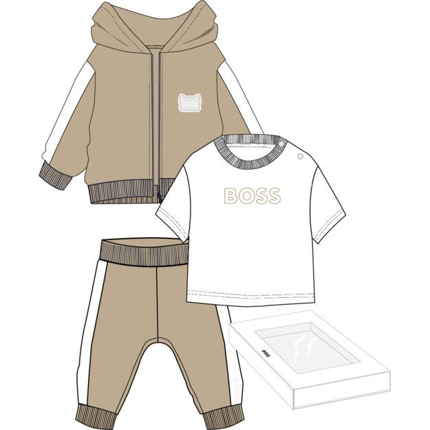 BOSS Baby Boys Gift Boxed set x 3 - short sleeve cotton jersey t-shirt with BOSS logo on the front and poppers on one shoulder, with gorgeous hooded tracksuit with colour block on the shoulders and sleeves and rubber panda logo badge on the chest - with matching joggers with colour block on the legs with BOSS logo on the ankle.   The perfect new baby gift.