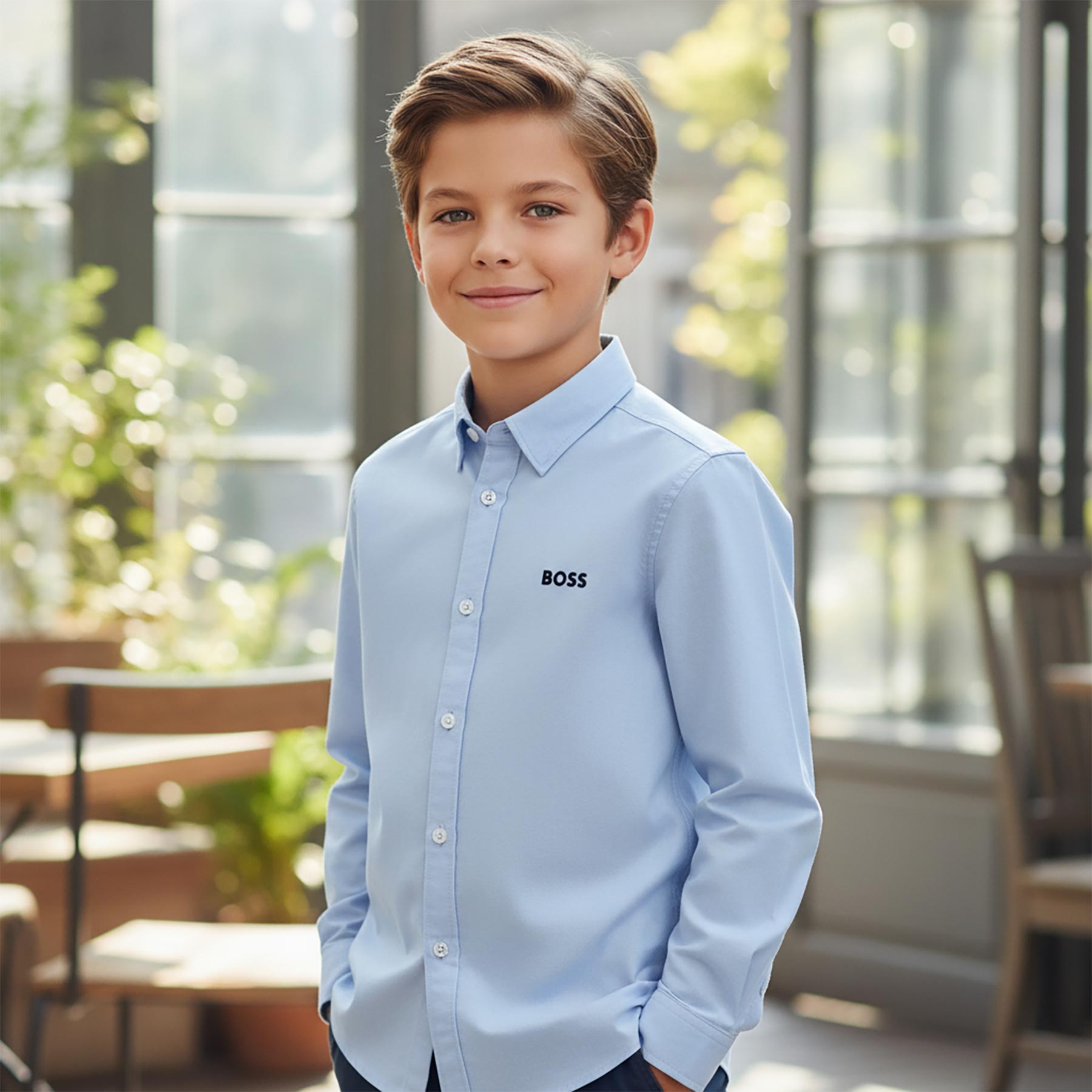 BOSS Boys long sleeved 100% cotton Oxford weave, with embroidered BOSS logo in blue on the chest, woven BOSS label on the side.  Pearl button front and cuffs. Regular fit.  Other matching items available.  Available in other colours.  Matching shirt available in baby sizes 3 months to 3 years.