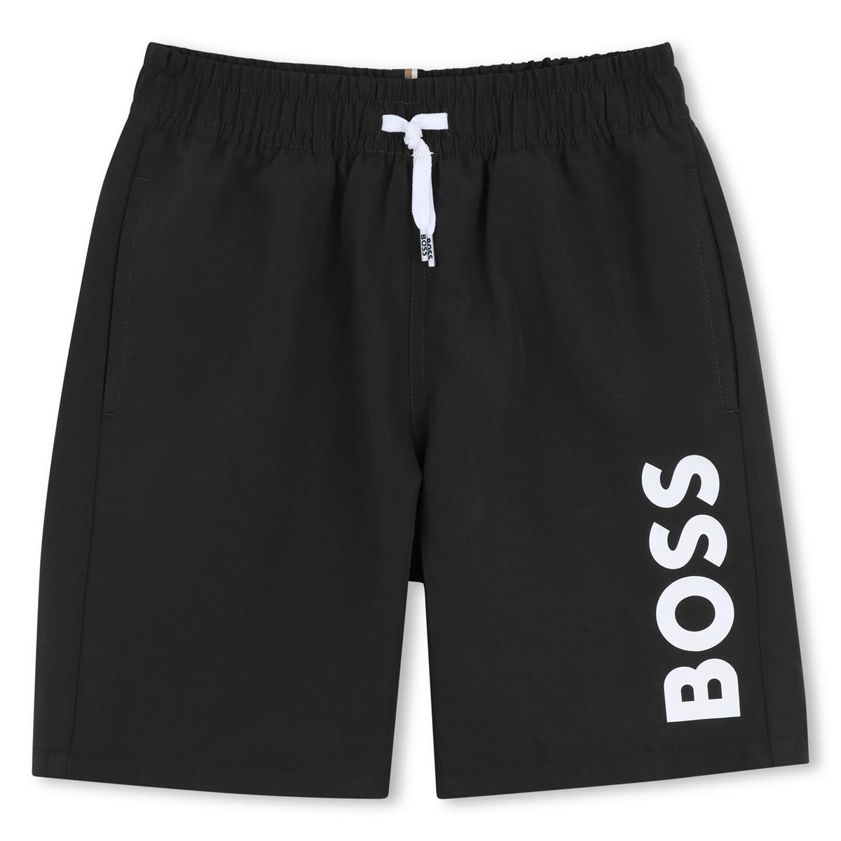 BOSS Boys Classic style Mini Me swim shorts - with side pockets. The shorts feature a contrasting white 'BOSS' logo on the left leg. The waistband is elasticated with a drawstring tie with BOSS logo ends and there is a mesh pant lining.  Other matching items available.