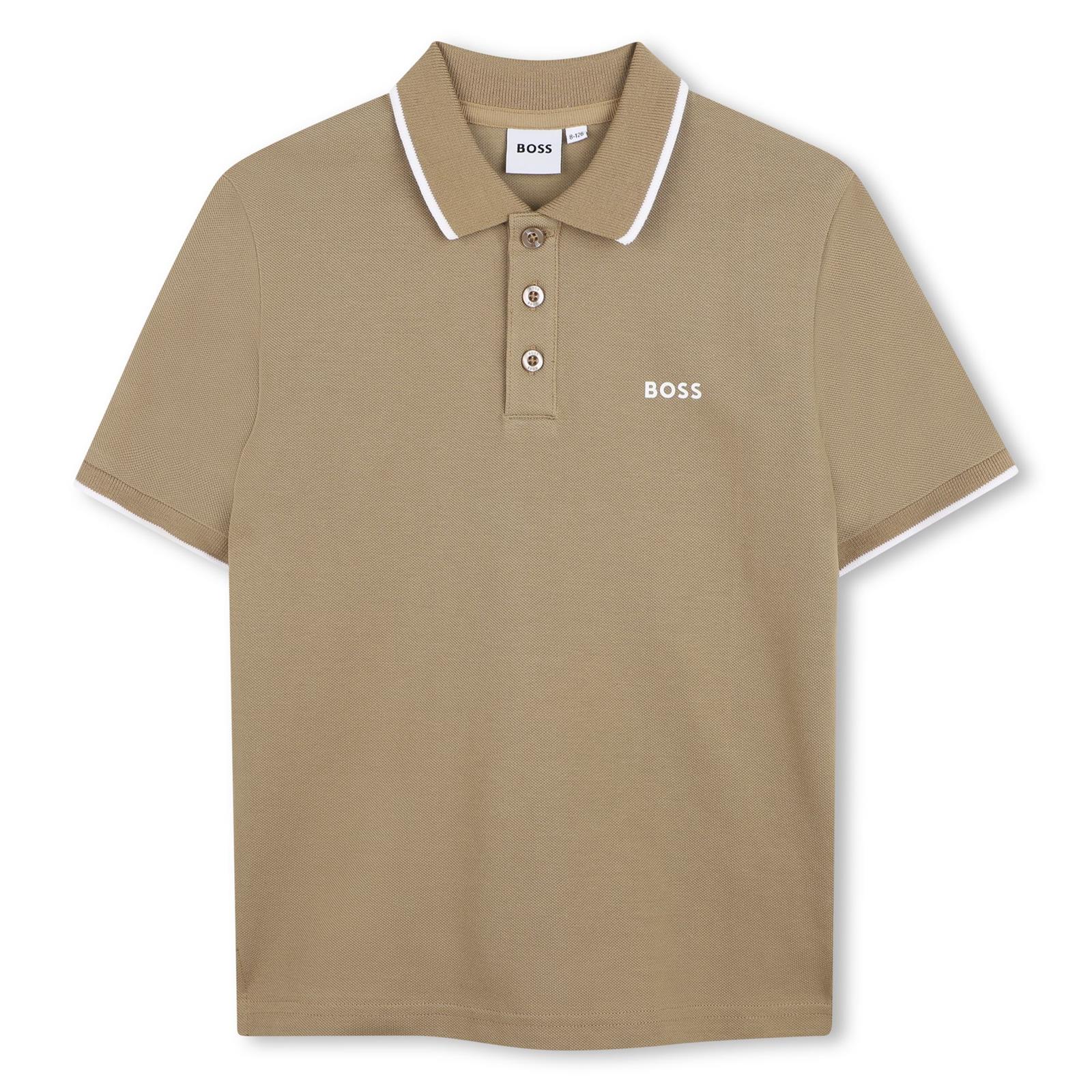 BOSS Boys Classic style short sleeve polo with contrasting edge. The polo features 3 buttons and a small 'BOSS' logo on the chest.  Made in soft stretchy 100% cotton pique. Polo collar with contrasting edge.  Perfect for wearing anytime.  Other matching items available.
