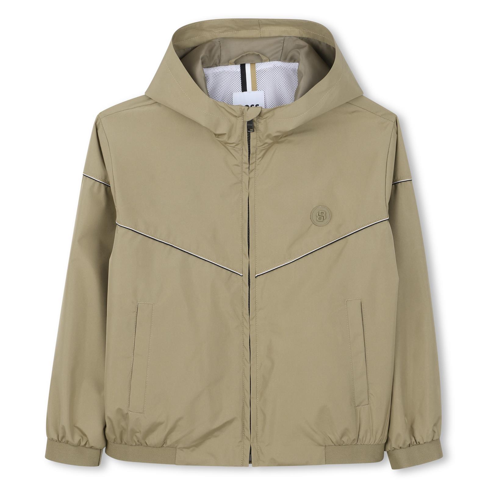 BOSS Boys Windcheater with recycled pongee hood.  Zipper front - side opening pockets and iconic color cut-outs.  Double B chest badge.  Mesh lining, fine rib cuffs and waistband.  Other matching items available.