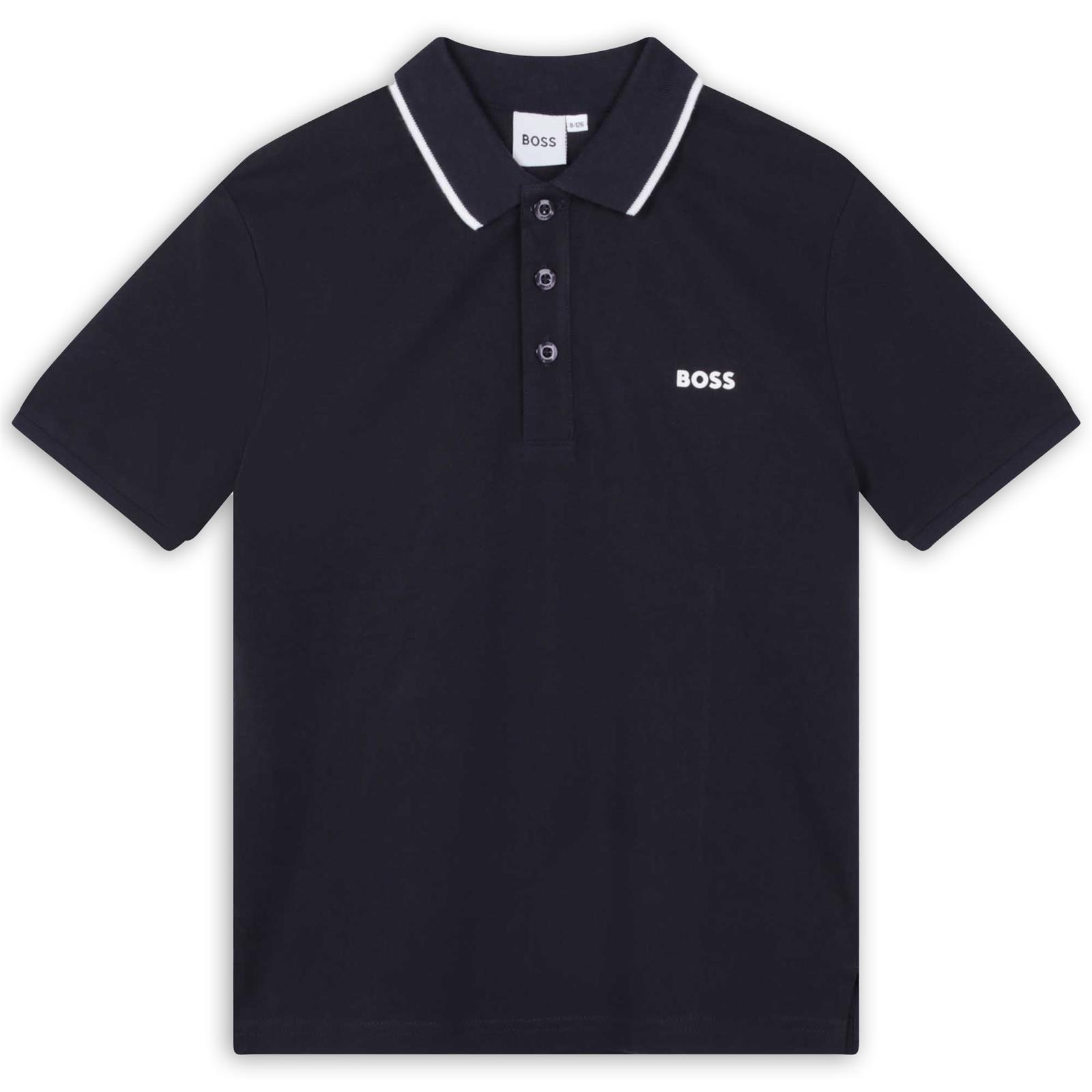 BOSS Boys Classic style short sleeve polo with contrasting edge. The polo features 3 buttons and a small 'BOSS' logo on the chest.  Made in soft stretchy 100% cotton pique. Polo collar with contrasting edge.  Perfect for wearing anytime.  Other matching items available.