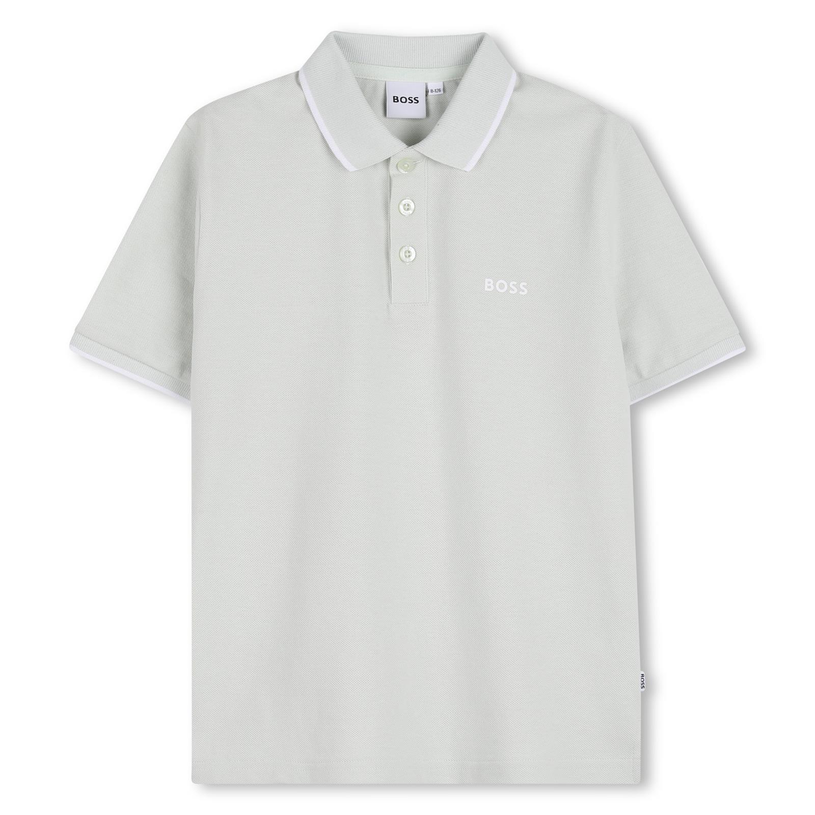 BOSS Boys Classic style short sleeve polo with contrasting edge. The polo features 3 buttons and a small 'BOSS' logo on the chest.  Made in soft stretchy 100% cotton pique. Polo collar with contrasting edge.  Perfect for wearing anytime.  Other matching items available.