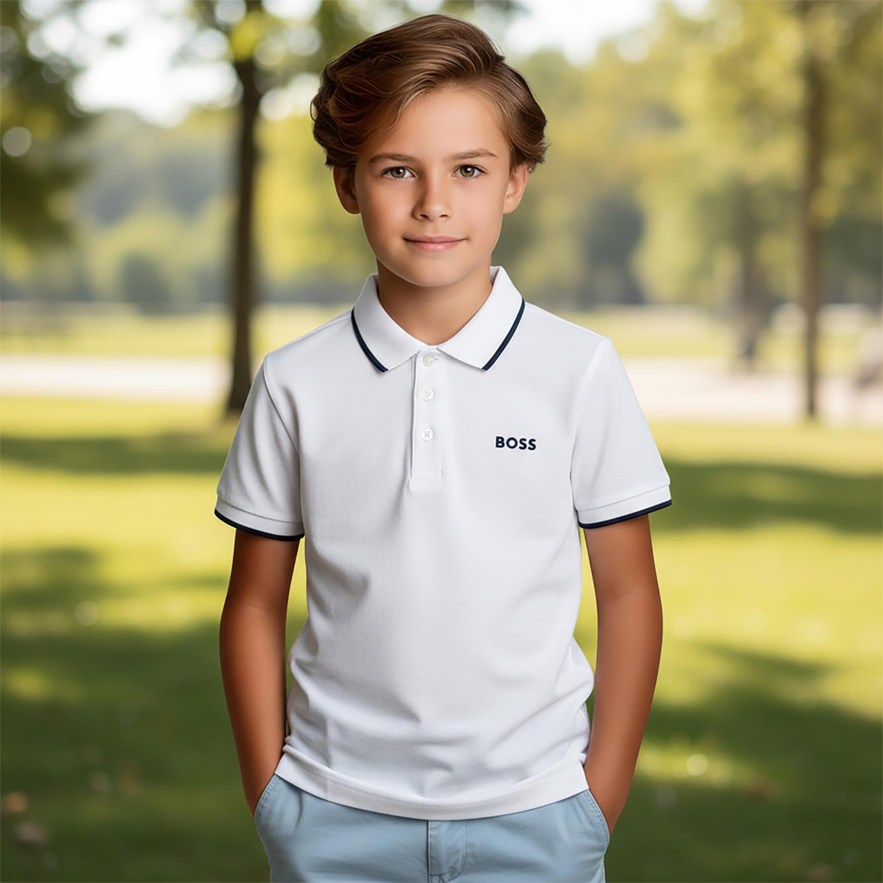 BOSS Boys Classic style short sleeve polo with contrasting edge. The polo features 3 buttons and a small 'BOSS' logo on the chest.  Made in soft stretchy 100% cotton pique. Polo collar with contrasting edge.  Perfect for wearing anytime.  Other matching items available.