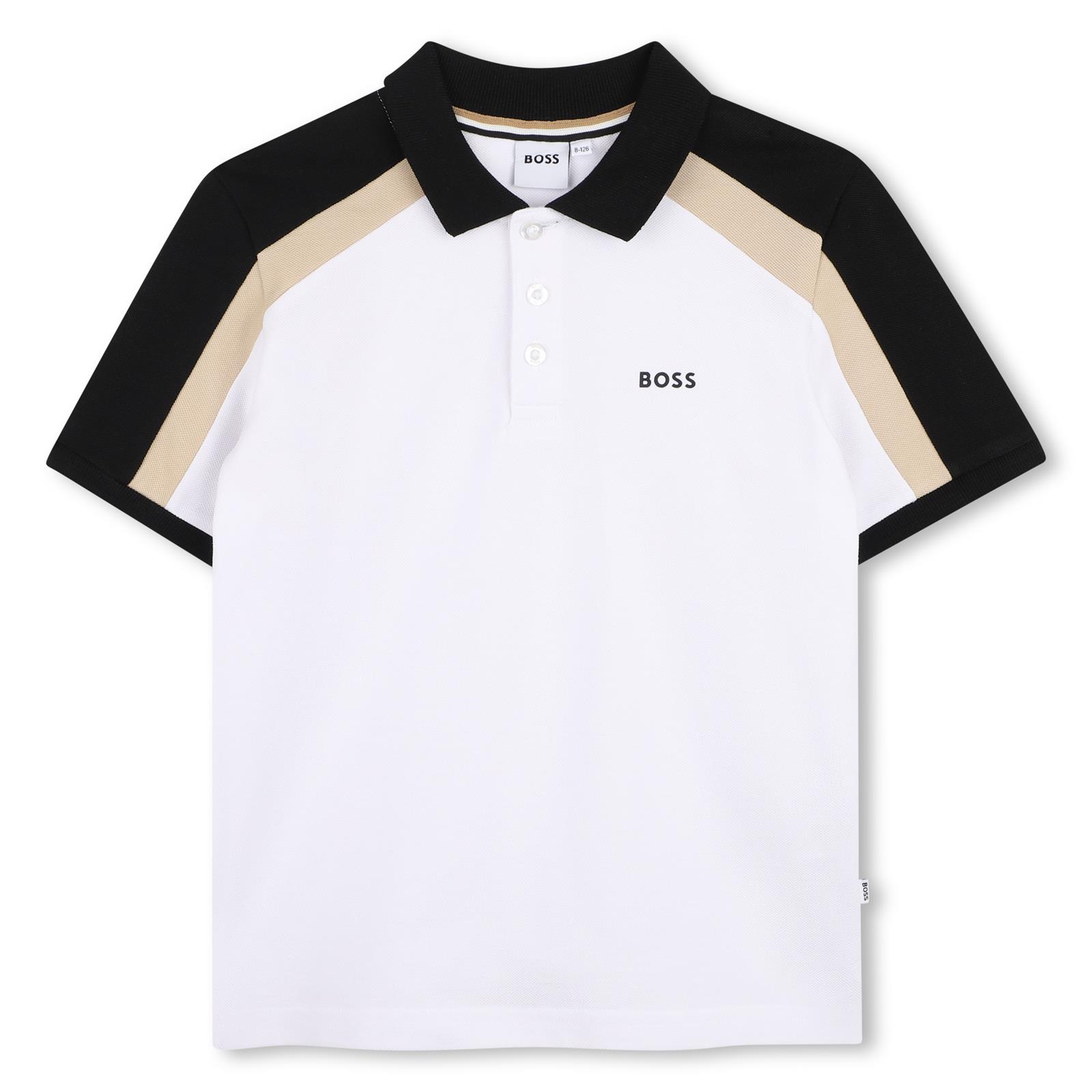 BOSS Boys Classic style short sleeve polo - regular fit. The polo has colourblock over the shoulders and sleeves and  features a contrasting 'BOSS' logo on the front.  Made in soft stretchy 100% cotton pique. Polo collar.  Perfect for wearing anytime.  Other matching items available.
