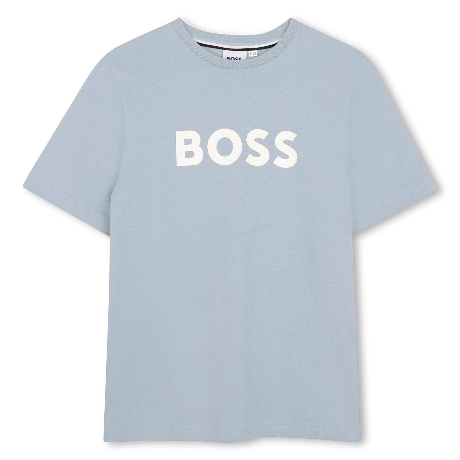 BOSS Boys Classic style short sleeve t-shirt - regular fit. The t-shirt features a contrasting 'BOSS' logo on the front.  Made in soft stretchy 100% cotton jersey with iconic stripes on the neckline lining.  Perfect for wearing anytime.  Other matching items available.