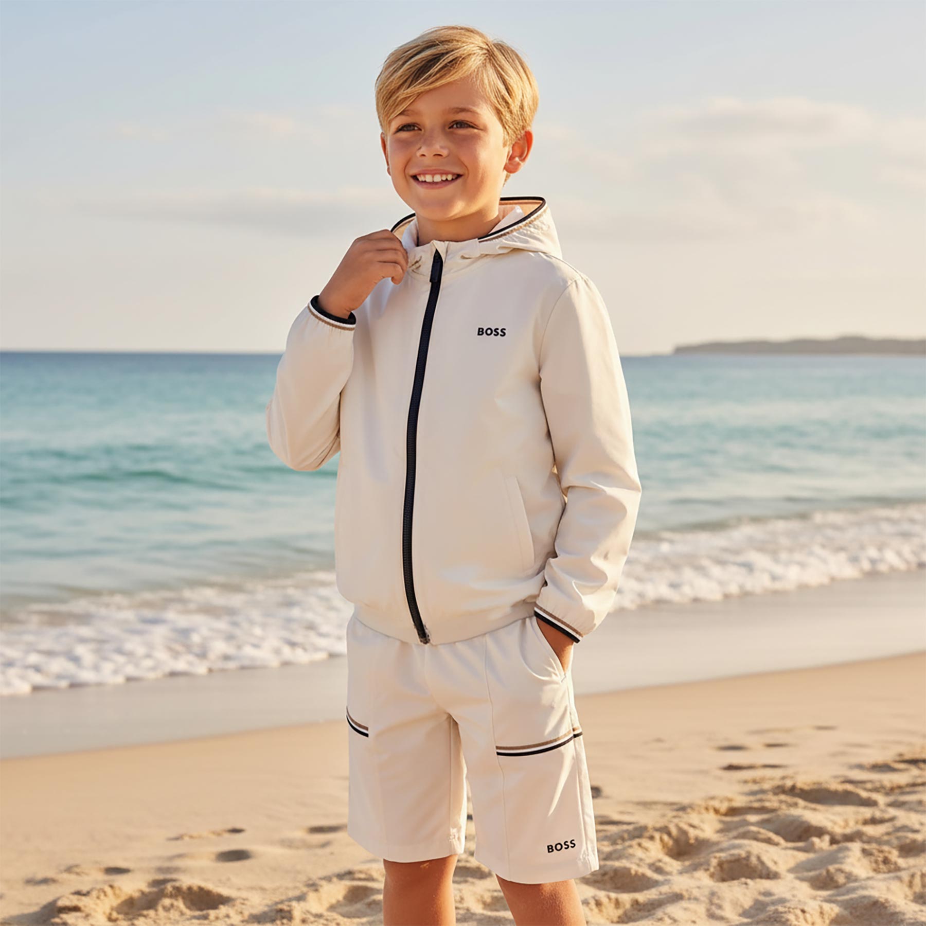 BOSS Boys Windbreaker with hood and matching shorts. Lightweight, UV resistant fabric - zippered closure. Elasticated cuffs and hood with iconic coloured stripes. BOSS logo on the chest. Bermuda shorts with iconic cut out details. BOSS logo on the bottom of the shorts. Elasticated waistband and side pockets.. Can be worn as seperates. Other matching items available.