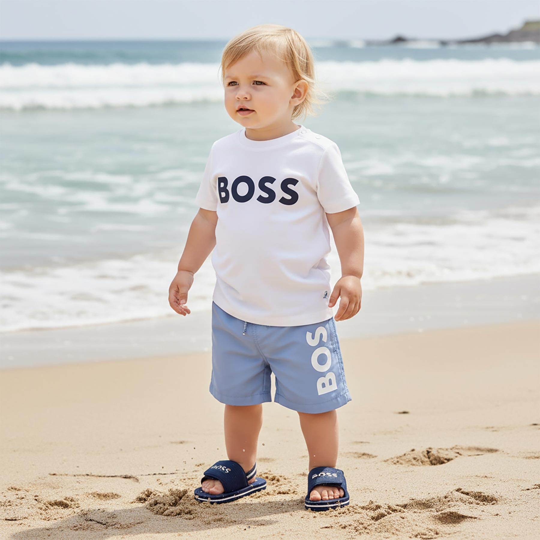 BOSS Toddler Boys Classic Swim Shorts. Classic style swim shorts featuring a contrasting BOSS logo down the left leg. The waistband is elasticated and has a drawstring tie with BOSS logo ends for a comfy fit. The shorts are lined with a mesh pant and have the iconic stripes tab at the back.