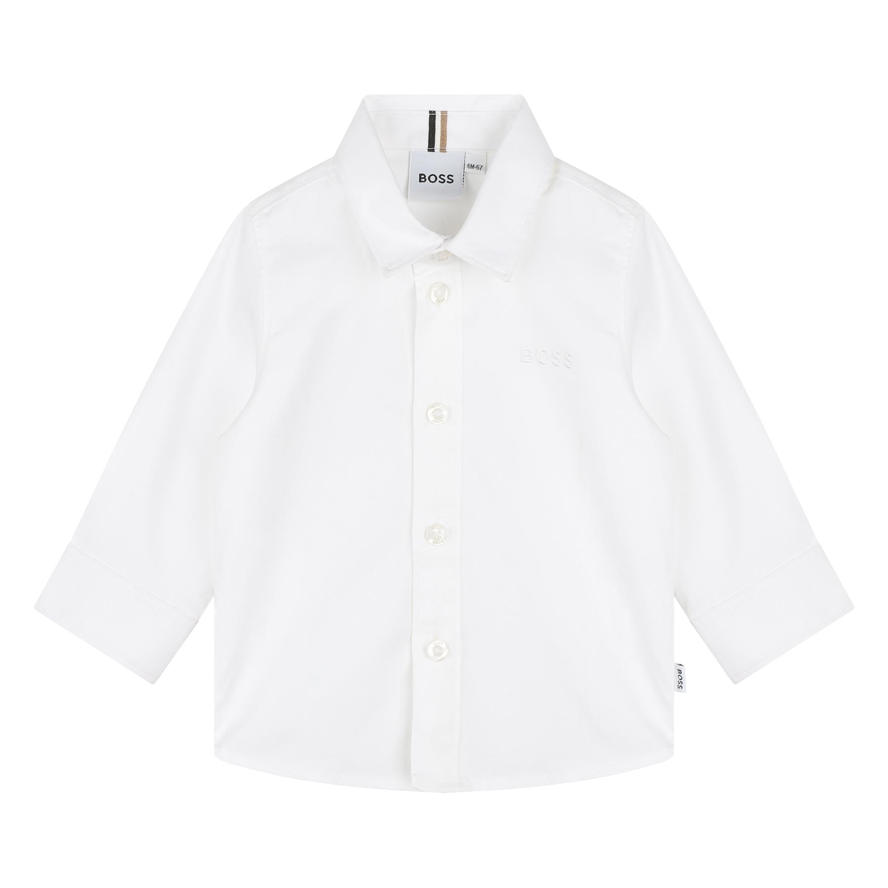 BOSS Toddler Boys Mini Me long sleeved shirt in 100% cotton, Oxford weave with embroidered BOSS logo on the chest, Iconic stripe detail inside the collar, pearl button up front and cuffs and woven BOSS logo label on the side.  Regular fit.  Available in ages 3 months to 3 years.  Bigger Boys version available in ages 4 years to 12 years.
