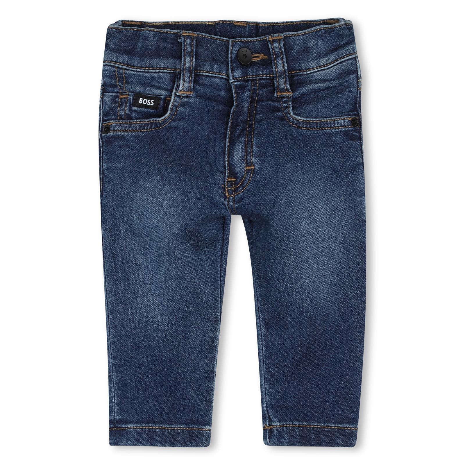 BOSS Toddler Boys stone wash denim trousers, made in a cotton polyester elastane denim with contrasting tan stitching. With an elasticated waist at the back, button enclosure, 5 pockets and woven BOSS logo label on the ticket pocket on the front. Available in ages 3 months to 3 years. Regular fit with an adjustable waistband. Bigger boys version available 4 - 12 years.
