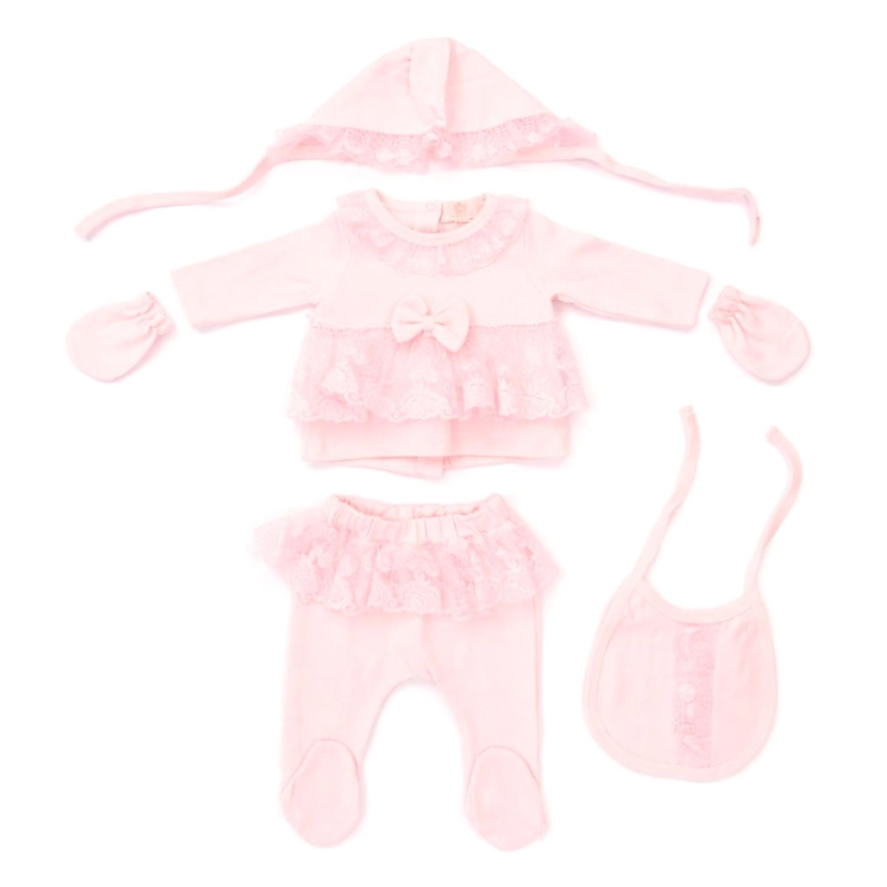 Caramelo Kids baby girls Summer Collection 5 piece set - soft pima cotton baby set with a beautiful lace ruffle across the bodice with large fixed bow - poppers up the back - comes with plain feet in bottoms, matching bonnet style hat trimmed with lace, matching bib trimmed with lace and jersey scratch mittens. Looks gorgeous on. The perfect new baby or baby shower gift. Also available in ivory.