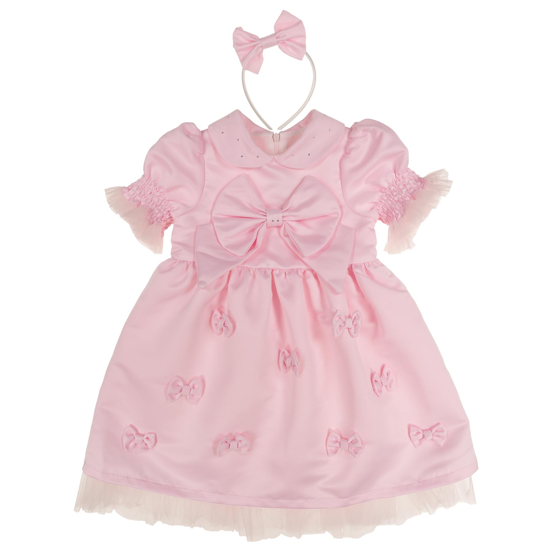 Caramelo Kids girls Royal Magic Collection big bow party dress & hairclip set - soft silky satin party dress with scattered diamantes on the oversized collar - puff sleeves with gorgeous soft tulle ruffles and a large fixed bow on the bodice - the skirt is very full with applique bows all over the front of the skirt - lined with a petticoat. Concealed zip at the back. Looks gorgeous on. The perfect party or weekend outfit. Sizes available 1-2 years to 8-9 years - perfect little sister / big sister outfits.