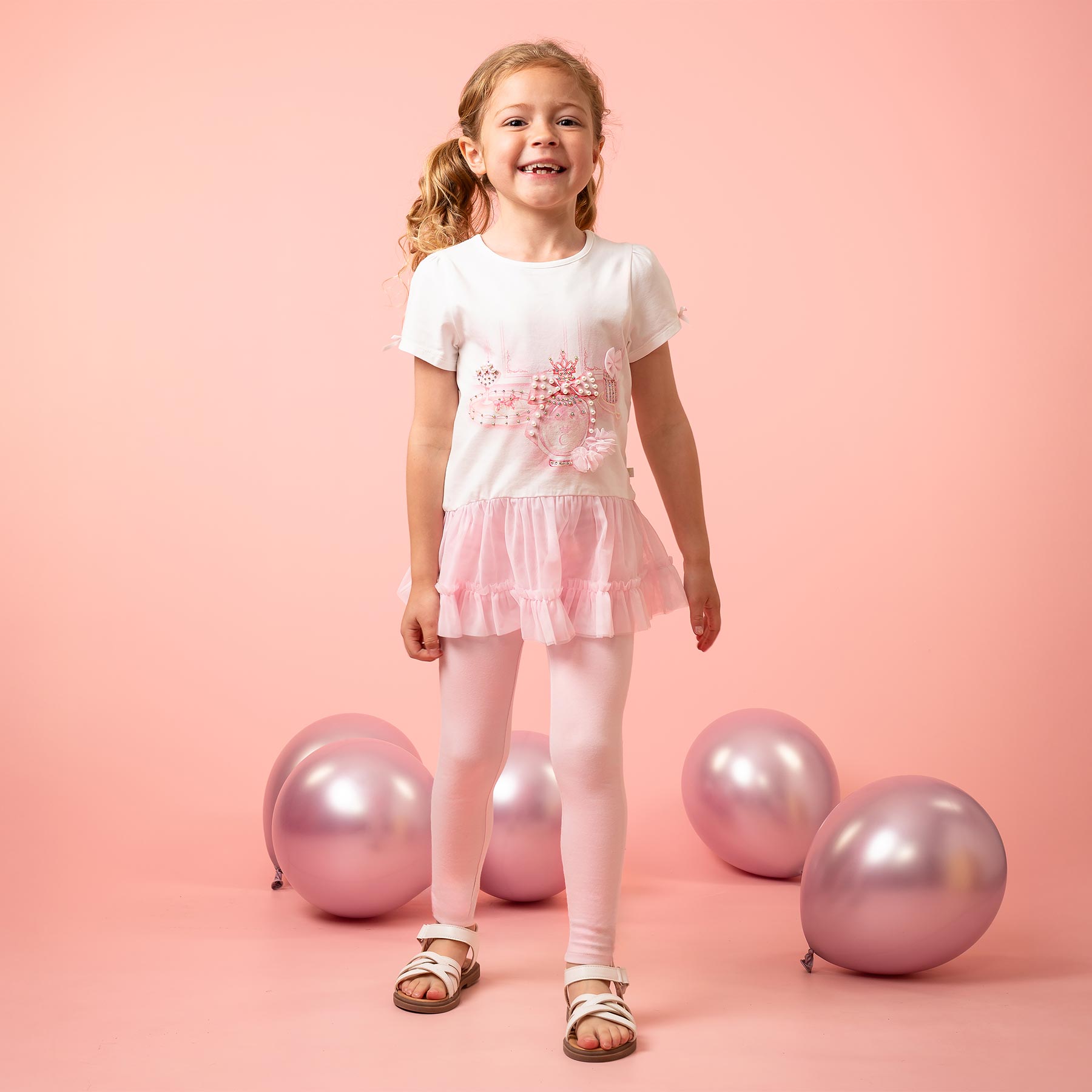 Caramelo Kids girls Summer Collection 2 piece tunic & legging set x 2 with Caramelo Bracelet Keyring gift - soft cotton jersey tunic with short sleeves and ruffle hem in tulle with perfume print decorated with pearls, diamante and applique tulle bows and flowers, and matching jersey leggings. Looks gorgeous on. Very stylish and comfortable. Comes with free gift of Caramelo bracelet keyring.