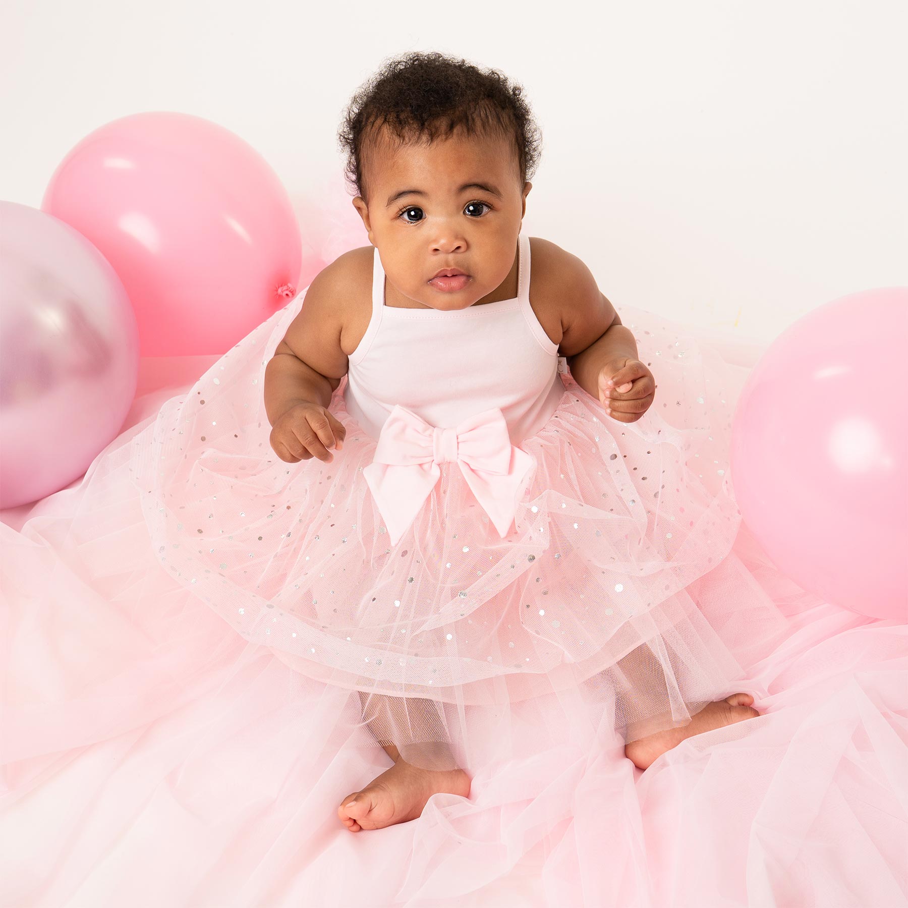 Caramelo Kids toddler girls Summer Collection strappy party dress - jersey cotton strappy top with very full soft tulle skirt with scattered silver foil polka dots and cotton underskirt. Large fixed bow on the front of the waist. Very pretty - easy to wear and perfect for parties and special occasions. Looks gorgeous on. Big sister version also available - perfect little sister / big sister outfits. Great holiday outfit for the hot evenings.