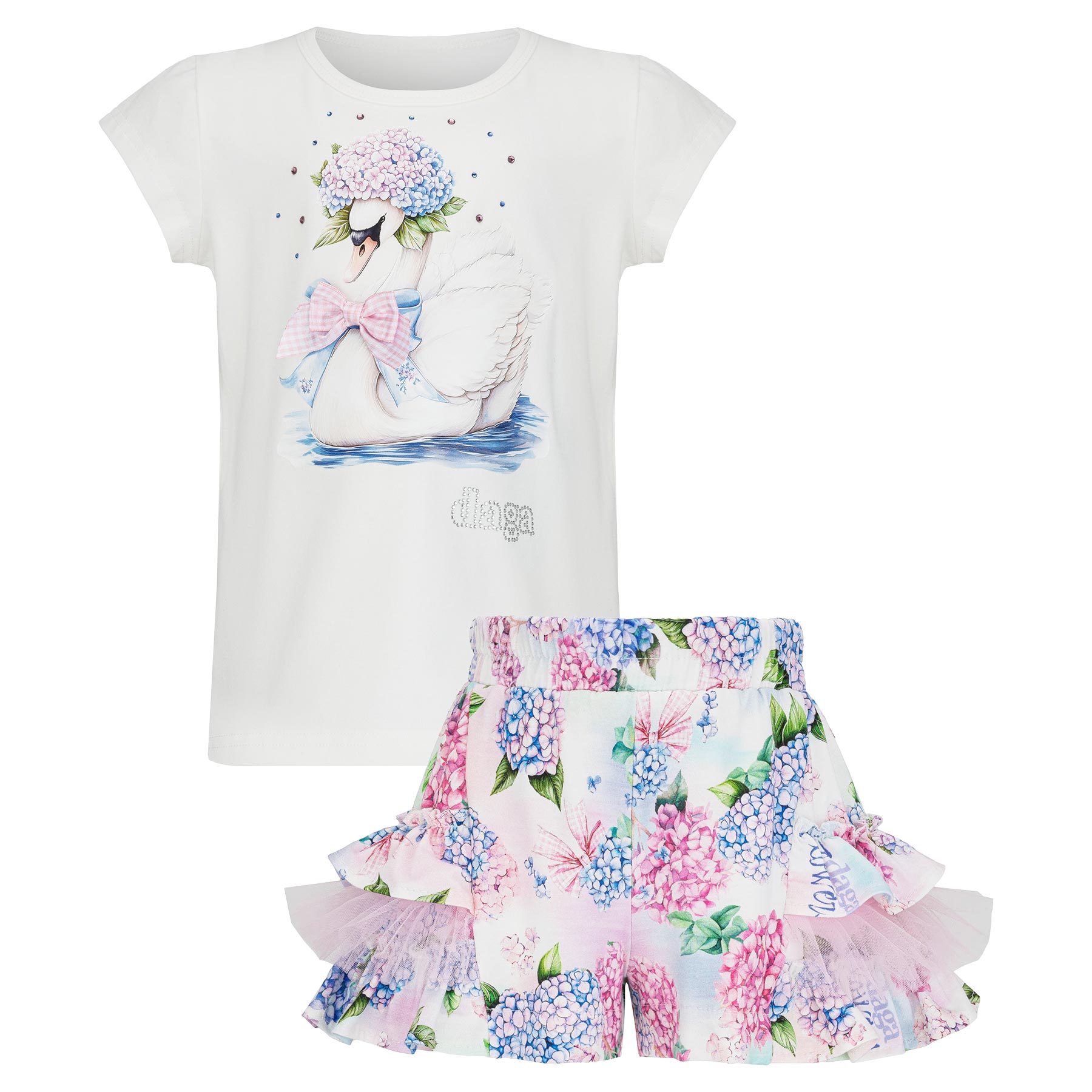 Daga - Girls Pastel Bloom 2026 Summer Collection - Gorgeous short sleeve top with swan print and hydrangea print shorts with tulle ruffles set.  Soft stretchy jersey set which is easy to fit and wear.    Matching items also available.  Made in Poland.   Perfect little sister/big sister outfits.