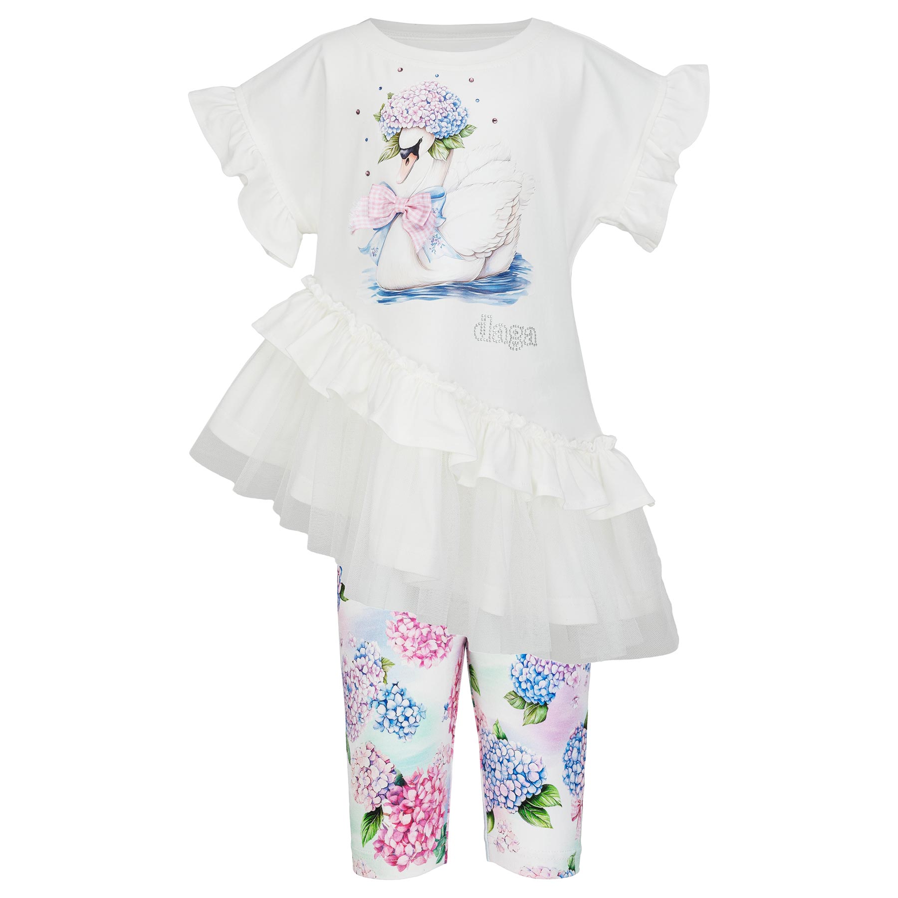Daga - Girls Pastel Bloom 2026 Summer Collection - Gorgeous short sleeve top with ruffles, slanted hem and hydrangea print leggings set. Soft stretchy jersey set which is easy to fit and wear. Matching items also available. Made in Poland. Perfect little sister/big sister outfits.