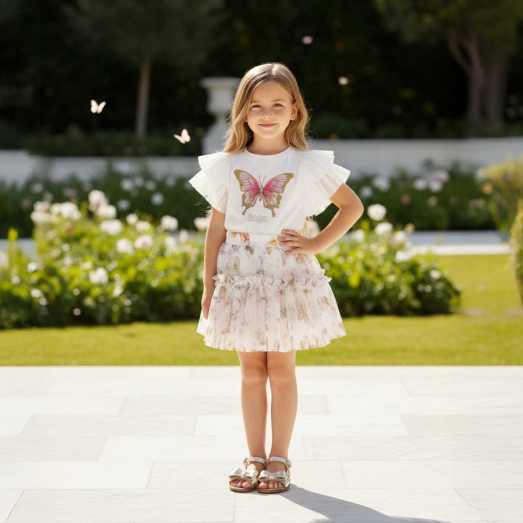 Daga - Girls Twinkle Flight 2026 Summer Collection - Gorgeous jersey sweater with applique butterfly on the front and tulle overlay ruffles on the sleeves and twinkle flight butterfly print poplin shorts with more tulle ruffles on the hips set x 2.   Matching items also available.  Made in Poland.   Perfect little sister/big sister outfits.