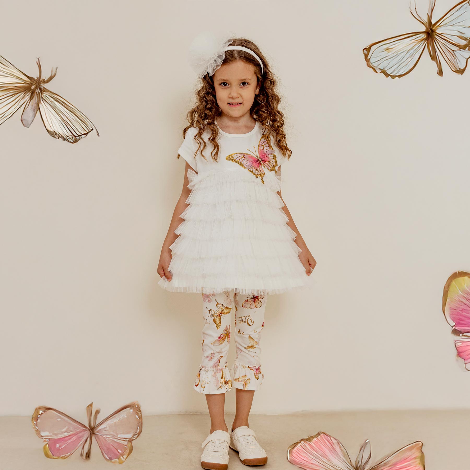 Daga - Girls Twinkle Flight 2026 Summer Collection - Gorgeous ruffle tunic and twinkle flight butterfly print leggings set. Soft stretchy jersey set which is easy to fit and wear. Matching items also available. Made in Poland. Perfect little sister/big sister outfits.