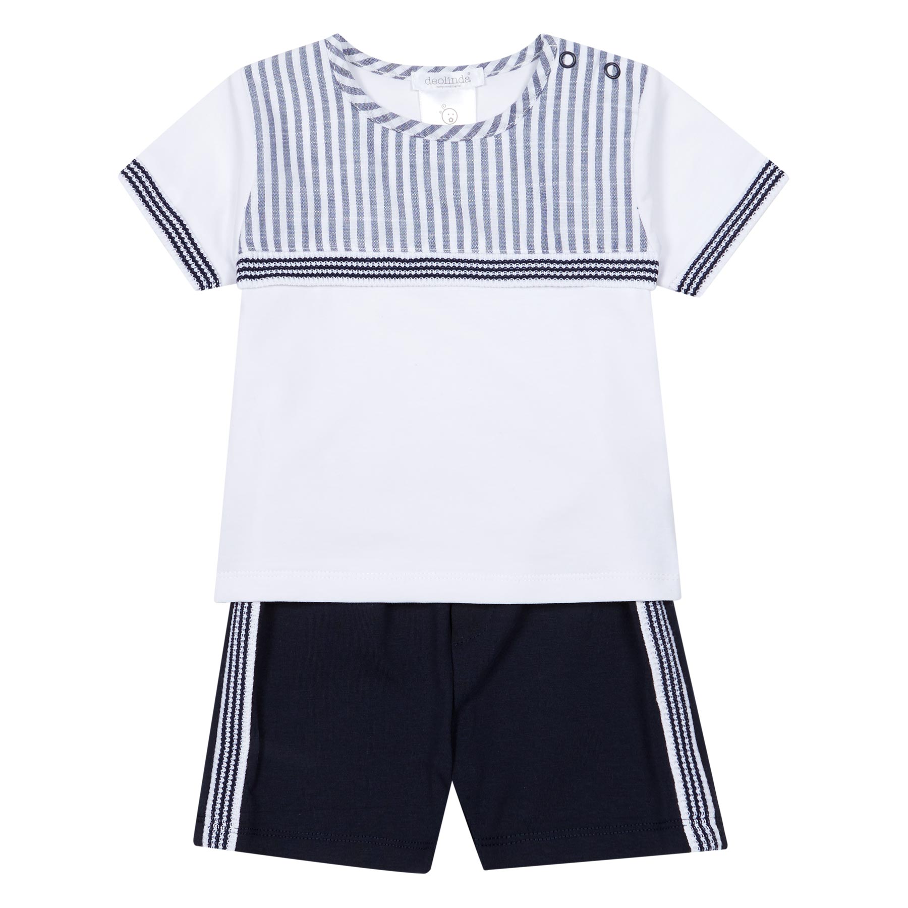 Deolinda boys stylish Astra collection shorts set - stretchy cotton top in white with navy stripe print with poppers on the shoulder - navy stripes on the sleeves, bodice and navy shorts - with elasticated waistband. Made in Portugal.