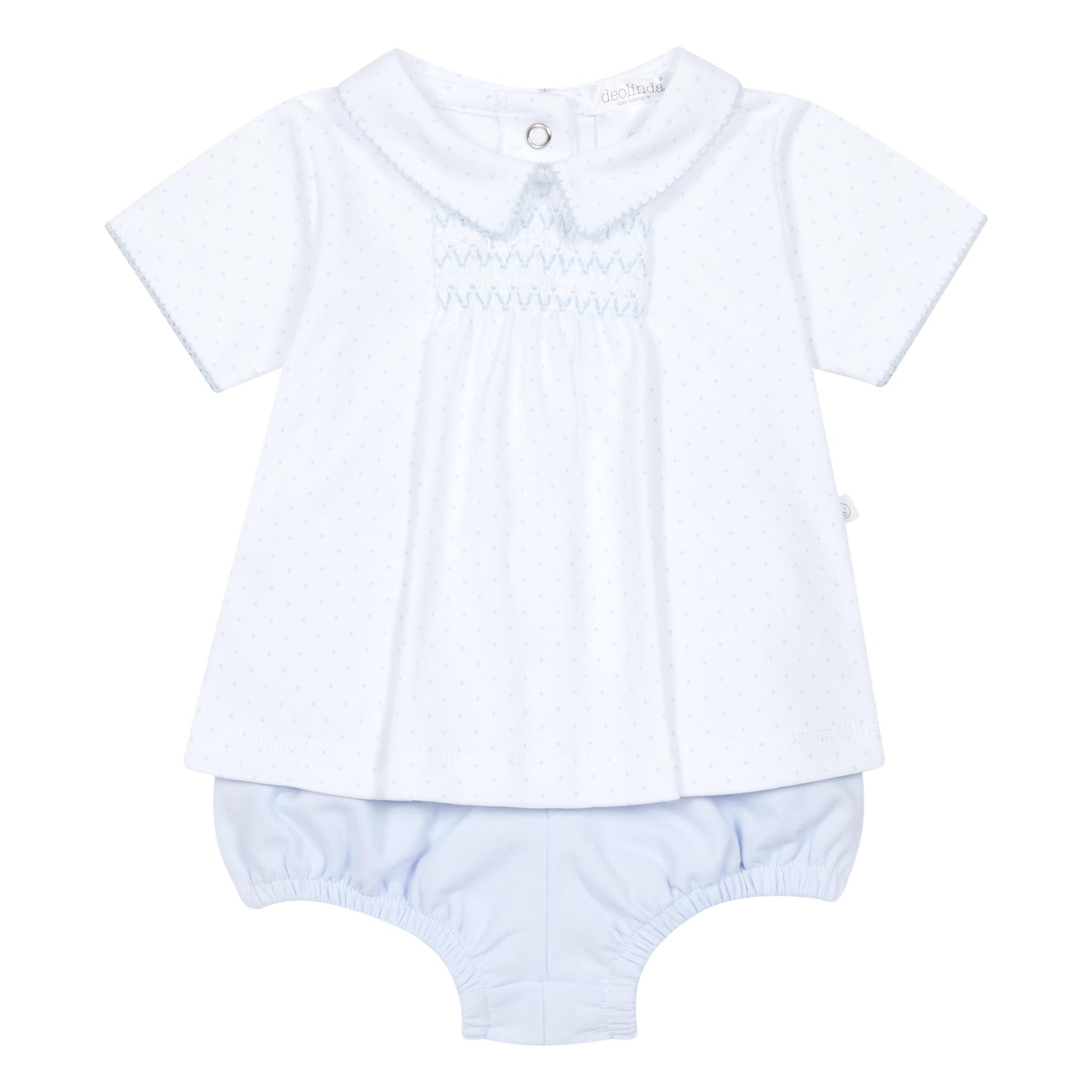 Deolinda baby boys gorgeous Confetti polka jersey bloomer set x 2 - soft cotton polka loose fitting top with smocked panel on the front and embroidered edge sleeves and collar.  Poppers up the back - comes with plain blue brushed cotton bloomers with elasticated waistband and legs.  Made in Portugal.    Other matching items in this collection.  The perfect baby gift.