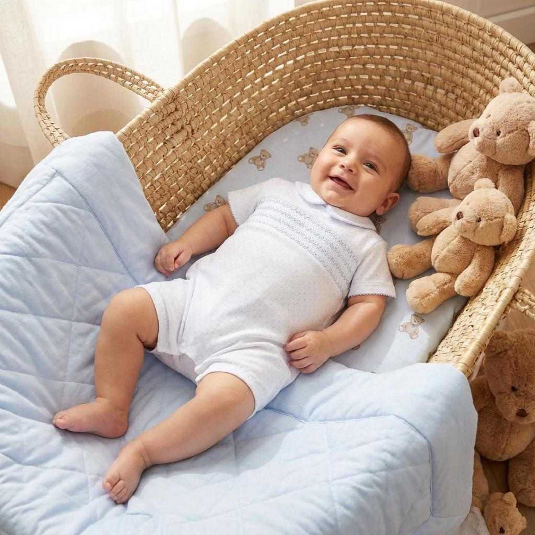 Deolinda baby boys gorgeous Confetti polka jersey romper - soft cotton polka romper with smocked panel on the front and embroidered edge sleeves and collar.  Poppers up the back and between the legs for easy changing. Made in Portugal.    Other matching items in this collection.  The perfect baby gift.