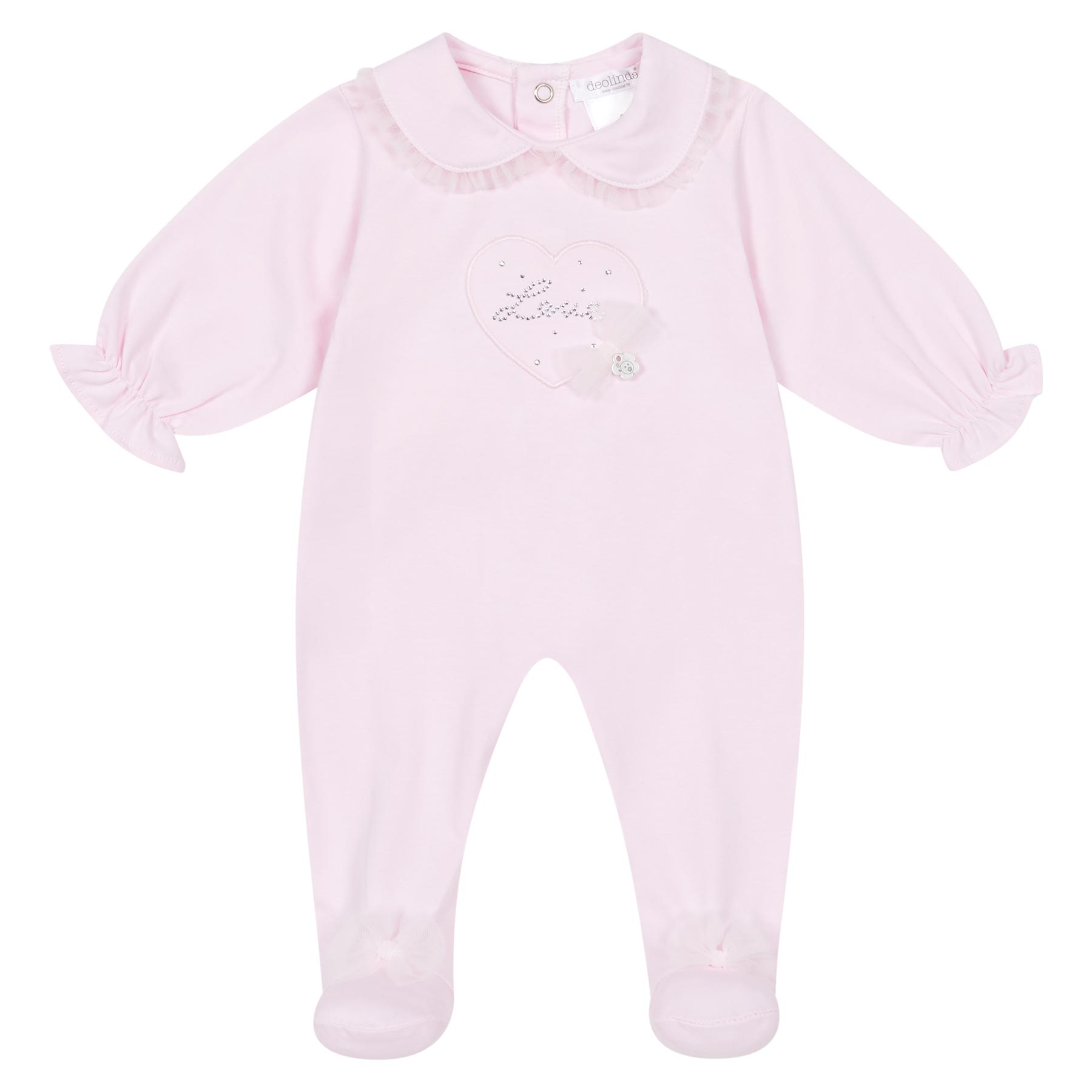 Deolinda baby girls gorgeous Amore babygrow in gift box - pretty cotton jersey babygrow with pretty heart applique on the front with diamante 'Love' and tulle bow with charm, gently elasticated cuffs and soft tulle bows on the feet - soft tulle ruffles on the peter pan collar. Poppers up the back and between the legs for easy changing. Made in Portugal. Other matching items in this collection.