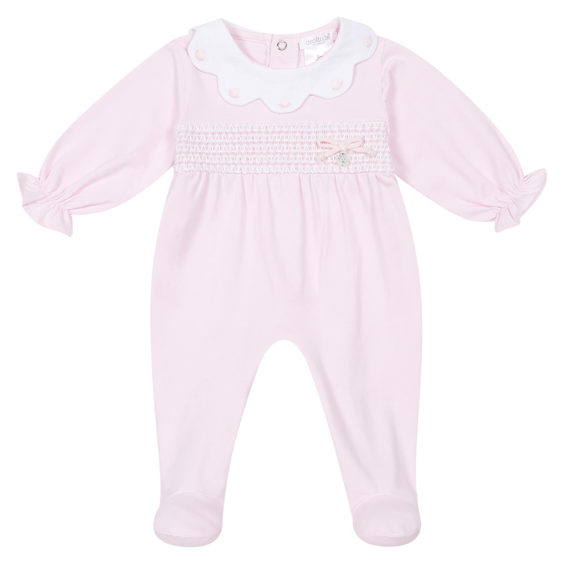Deolinda baby girls gorgeous California babygrow in gift box - pretty cotton jersey babygrow with pretty smocked panel on the front with tie and charm, and gently elasticated cuffs - contrasting scallop cotton collar with embroidered roses. Poppers up the back and between the legs for easy changing. Made in Portugal. Other matching items in this collection.