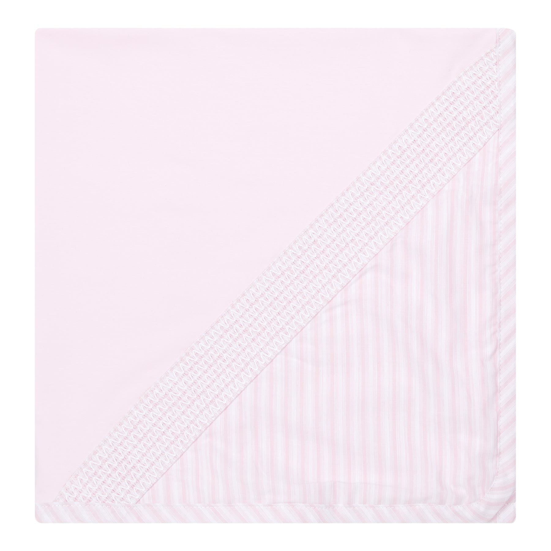 Deolina Baby girls California collection - this stylish Deolinda so soft fine jersey swaddle/blanket with pale pink stripe poplin corner and smocked panel. This gorgeous swaddle/blanket measures 80cm x 85cm - perfect for wrapping baby (like a tortilla is the best way) which helps them to be comfortable and sleep or for using in their pram or cot. The perfect Newborn or Baby Shower gift. This swaddle/blanket has other matching items available.