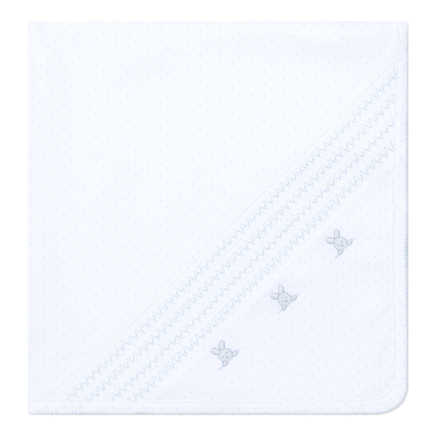 Deolina Baby boyss Confetti collection - this stylish Deolinda so soft fine polka dot jersey swaddle/blanket with smocked panel across the corner and embroidered bunnies. This gorgeous swaddle/blanket measures 80cm x 85cm - perfect for wrapping baby (like a tortilla is the best way) which helps them to be comfortable and sleep or for using in their pram or cot. The perfect Newborn or Baby Shower gift. This swaddle/blanket has other matching items available.