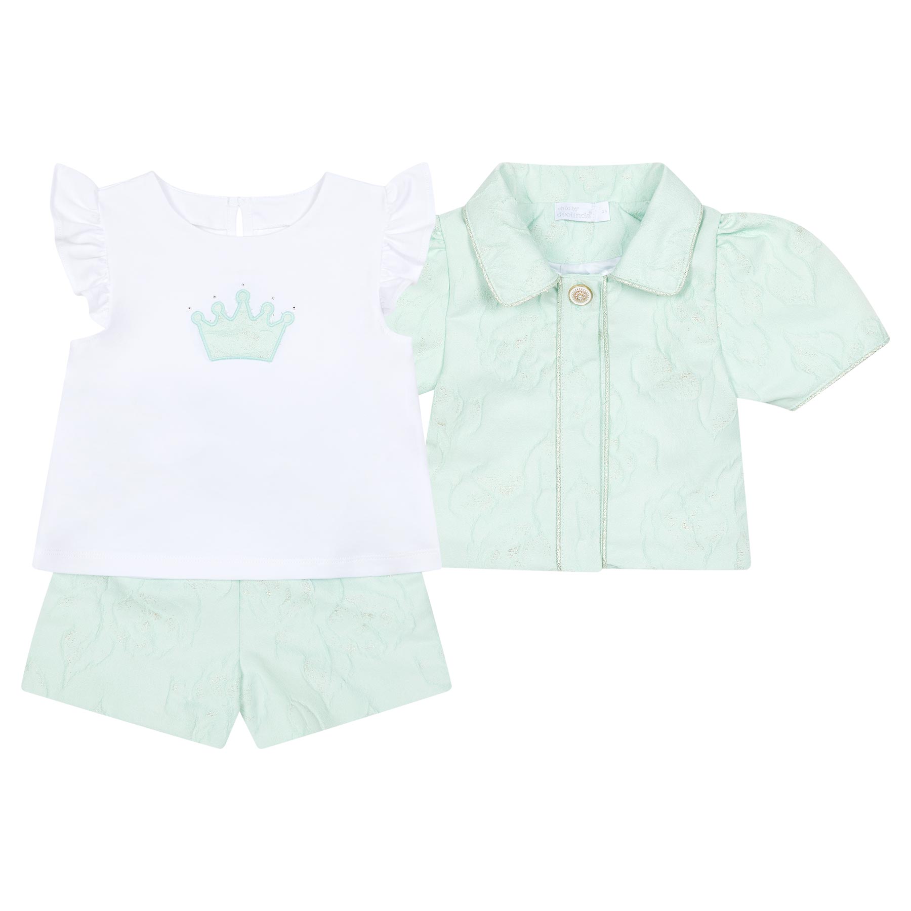 Deolinda Chic girls Linda Collection - a stunning summer 3 piece set made with textured fabric that is stunning - puff sleeve jacket with pearl and metal button to close, ruffle sleeve jersey top with mint Crown applique on the front - single button at the back of the neck and loose fitting shorts with metallic mint tie - fully lined with soft cotton. Stunning set. Made in Portugal. Other matching items available. Perfect for anytime. Perfect little sister/big sister outfit - matching headband and handbag also available.