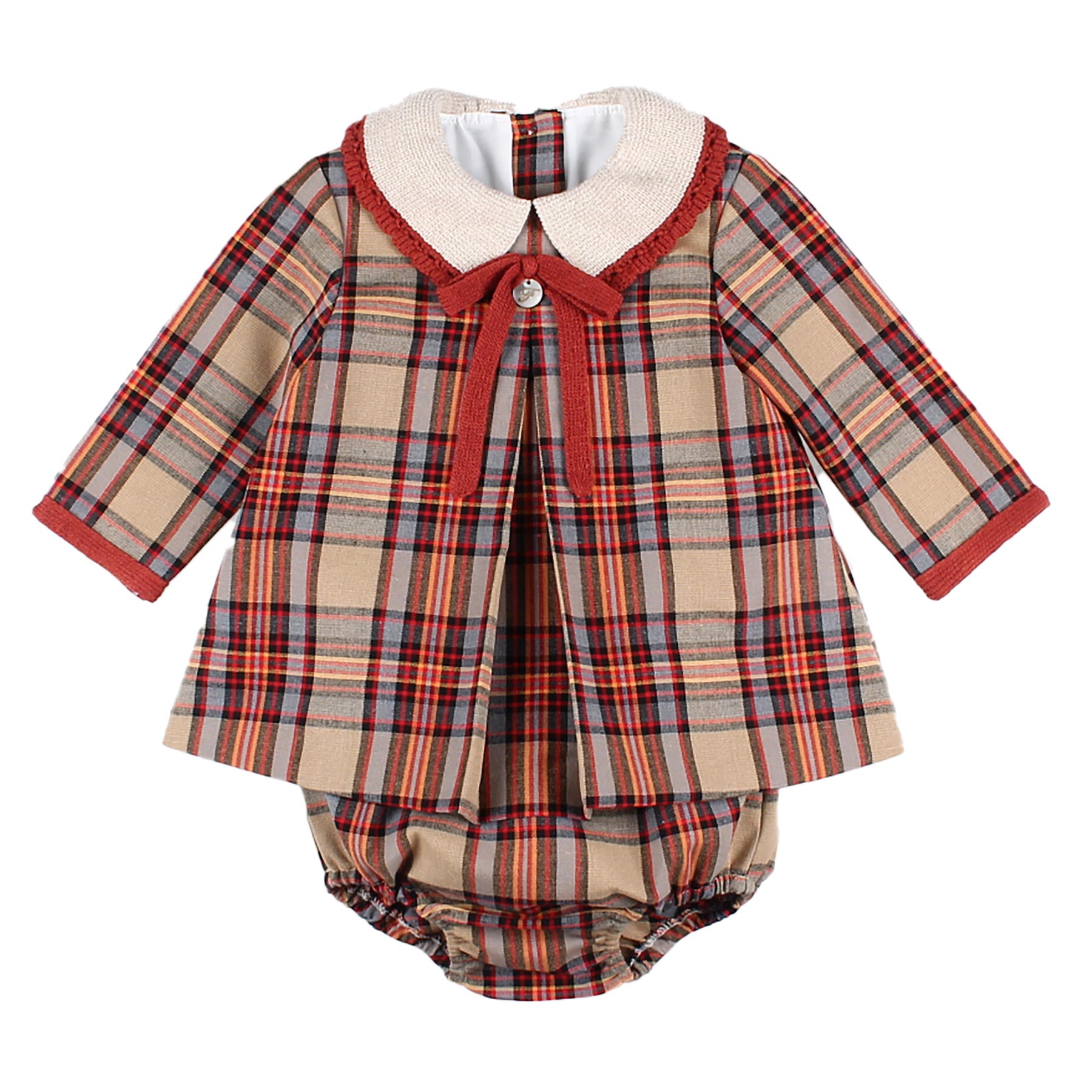 Foque girls gorgeous 2 piece set of long sleeve loose fitting dress with gorgeous knitted collar with openwork edge and pleat front and matching panties. The dress has buttons up the entire back and is lined with a petticoat edged with lace. There is a knitted bow with charm on the bodice. The panties have elasticated waistband and legs.This set is easy to wear and comfortable. Made in Spain. Matching sibling outfits available.