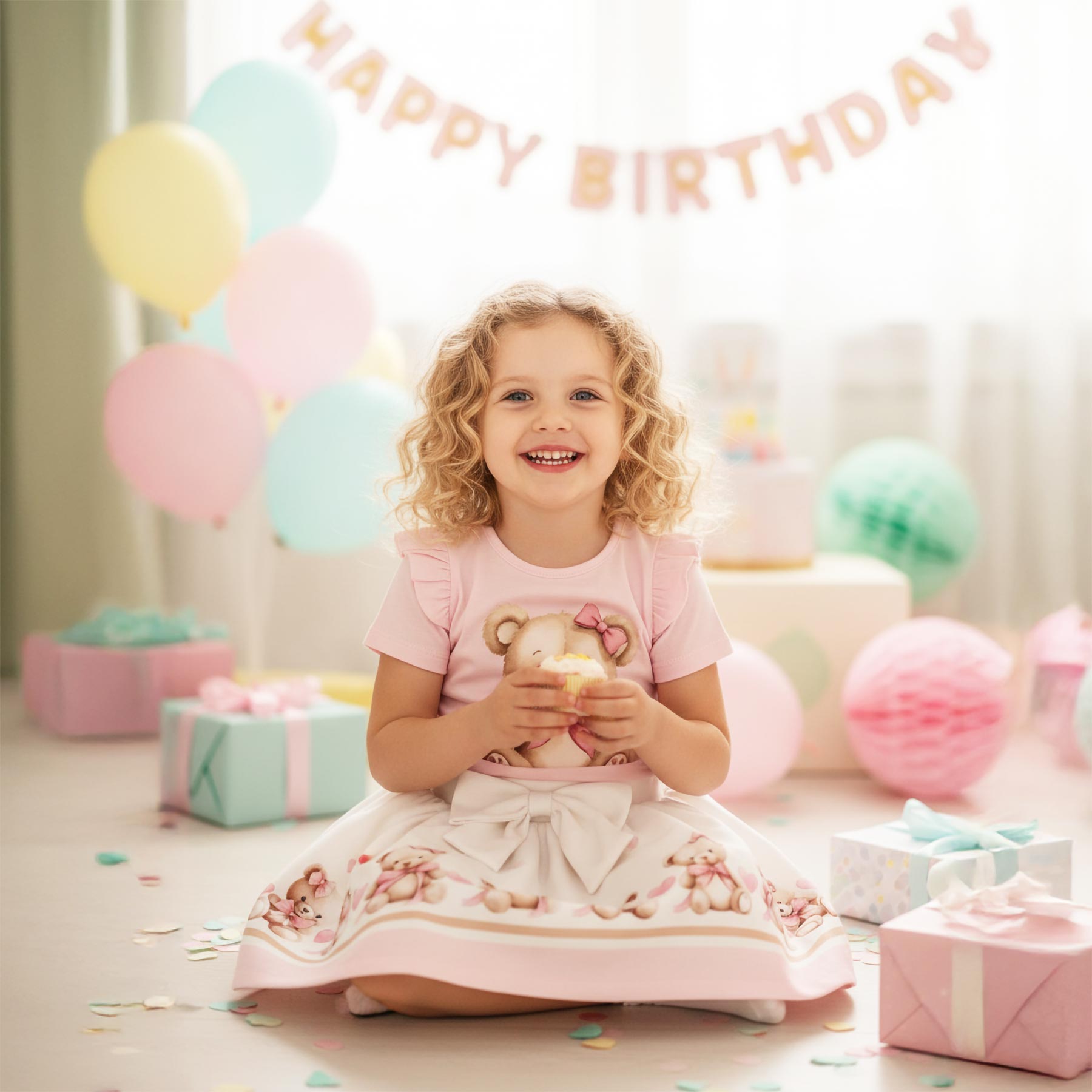 Giorgio Bambini girls ruffle top skirt and headband set x 3 - soft cotton jersey top with pretty Bear decoration on the front, with diamante, and ruffle tulle short sleeves- comes with teddy print skirt with elastic waistband.  Looks gorgeous on.  Fittings are good for the ages. The perfect party or weekend outfit. Sizes available 1-2 years to 7-8 years - perfect little sister / big sister outfits.