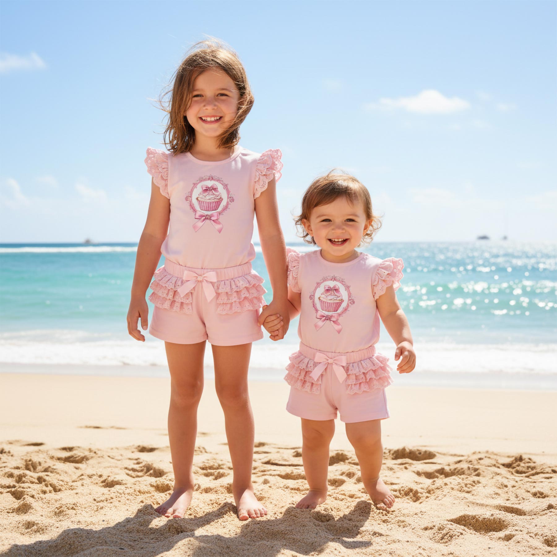 Giorgio Bambini girls ruffle sleeve top ruffle shorts and headband set x 3 - soft cotton jersey top with pretty Cupcake decoration on the front, with diamante, and double lace ruffle short sleeves- comes with jersey shorts with lace ruffles on the hips.  Looks gorgeous on.  Fittings are good for the ages. The perfect party or weekend outfit. Sizes available 1-2 years to 7-8 years - perfect little sister / big sister outfits.