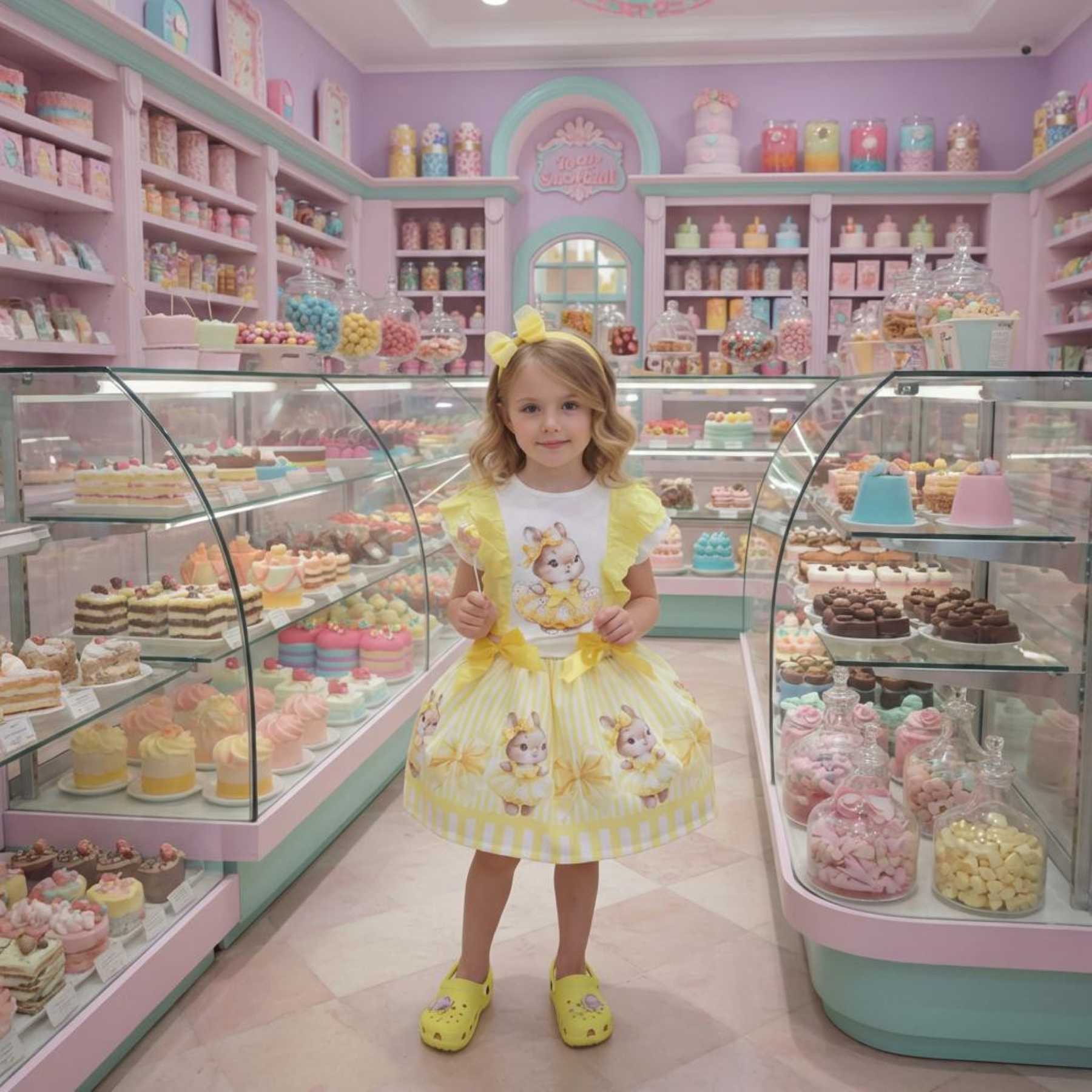 Giorgio Bambini girls ruffle top skirt and headband set x 3 - soft cotton jersey top with bunny decoration on the front, with diamante, and ruffle covered short sleeves and lace ruffles down the front of the top - comes with bunny print and lemon stripe skirt with elastic waistband. Looks gorgeous on. Fittings are good for the ages. The perfect party or weekend outfit. Sizes available 1-2 years to 7-8 years - perfect little sister / big sister outfits.
