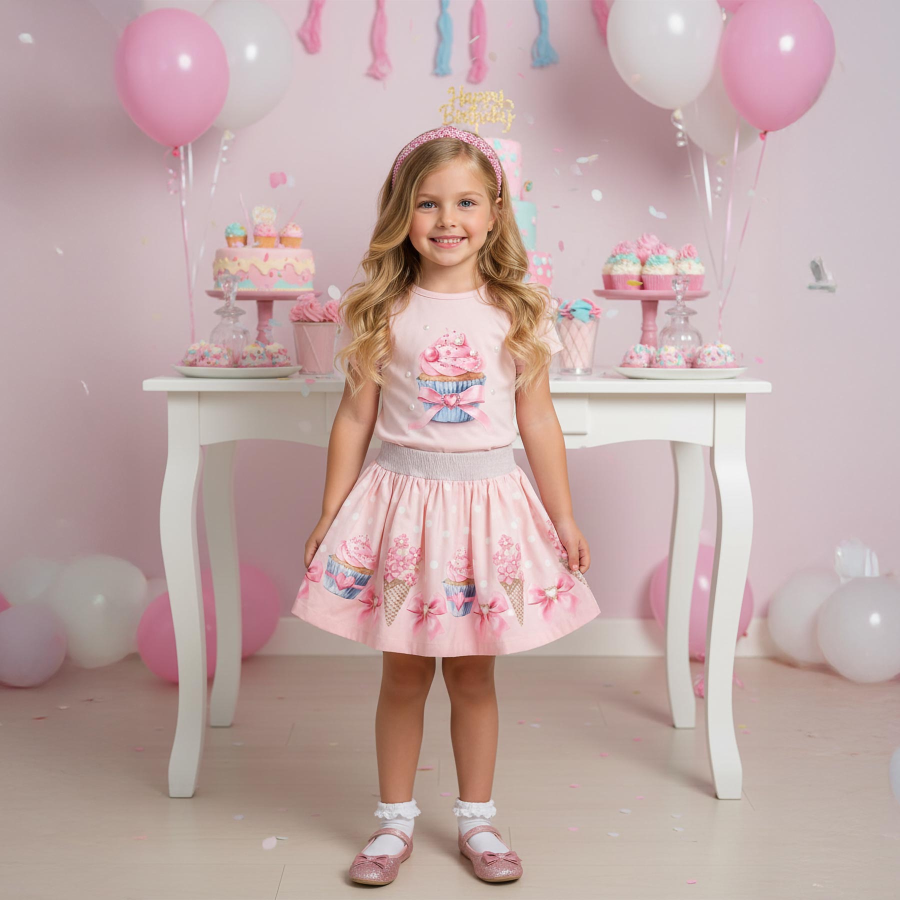 Giorgio Bambini girls ruffle top skirt and headband set x 3 - soft cotton jersey top with cup cake decoration on the front, with diamante, and ruffle tulle short sleeves- comes with cup cake and ice cream print skirt with elastic waistband. Looks gorgeous on. Fittings are good for the ages. The perfect party or weekend outfit. Sizes available 1-2 years to 7-8 years - perfect little sister / big sister outfits.