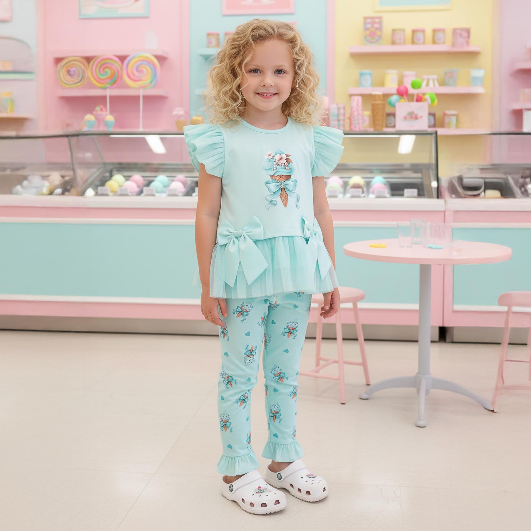 Giorgio Bambini girls tulle ruffle tunic leggings and headband set x 3 - soft cotton jersey tunic with ice cream decoration on the front, with diamante, and double ruffle tulle short sleeves, two fixed satin bows on the waist and tulle double ruffle hem - comes with ice cream print leggings with ruffle ankles and elasticated waistband.  Looks gorgeous on.  Fittings are good for the ages. The perfect party or weekend outfit. Sizes available 1-2 years to 7-8 years - perfect little sister / big sister outfits.