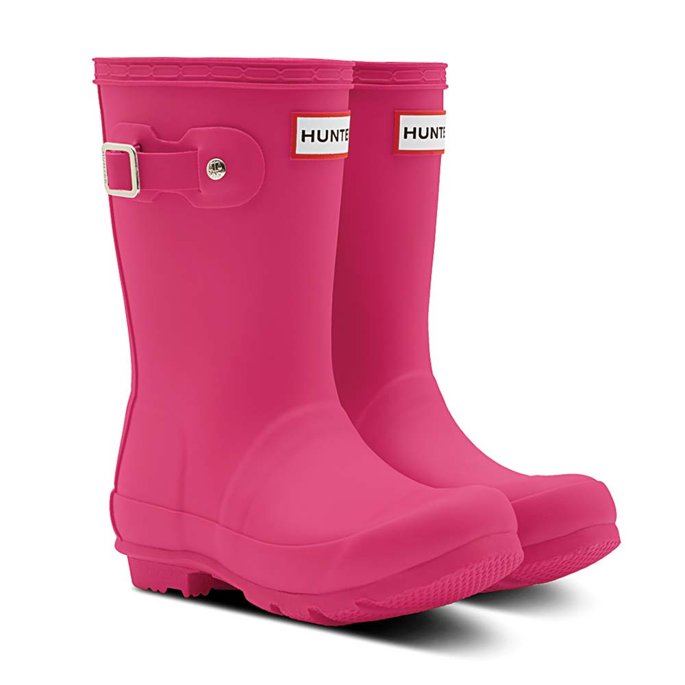 The handcrafted Hunter Original Big Kids wellington boot forms a mini version of the iconic Original Tall Boot, the Original Kids Wellington is a dream for junior explorers. This hunter waterproof boot is handcrafted from natural rubber. Designed for adventures, specialised kids wellies are highly resistant to wear and abrasion with a 100% recycled polyester lining for comfort. Reflective patches and the Hunter Original tread offer added safety so you can be confident letting them take on the elements whatever the weather..
