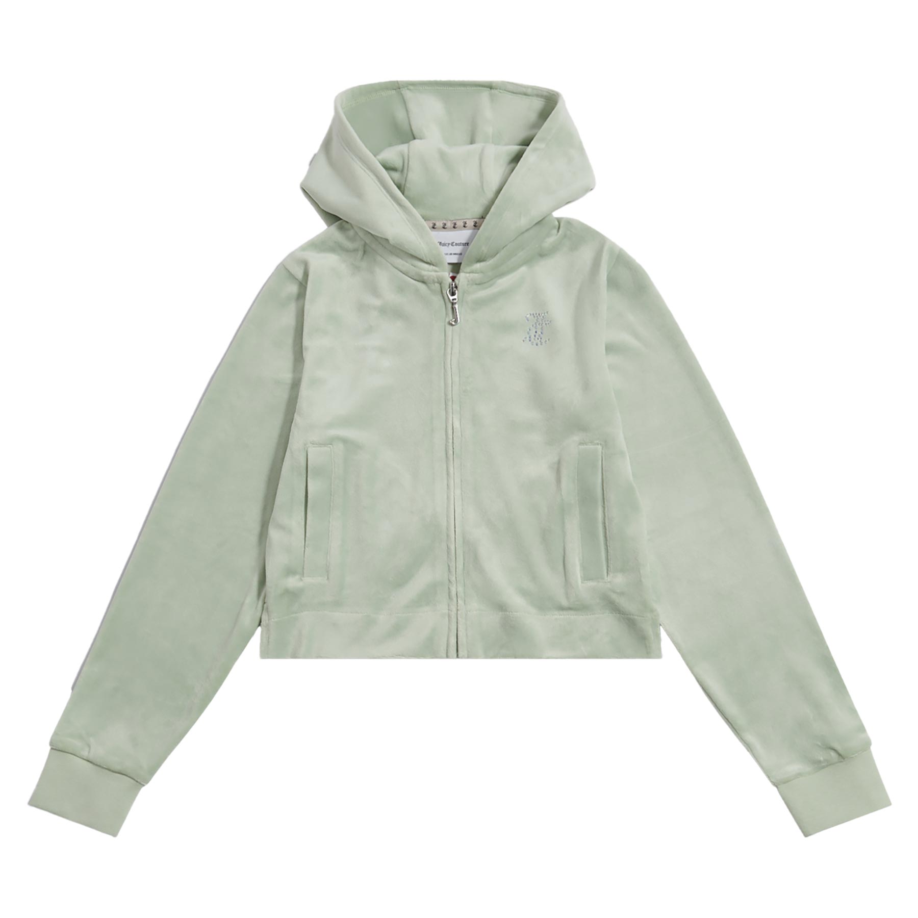 Juicy Couture girls zip though velour hoodie. Super soft stretchy velour hoodie with diamante Juicy logo on the chest, and diamante Juicy Couture arch logo across the shoulders at the back, front zipper with silver metal 'J' pull and pouch pocket on the front. Ribbed jersey cuffs and waistband. So comfortable to wear and looks amazing on. Other colours available. Matching joggers available.