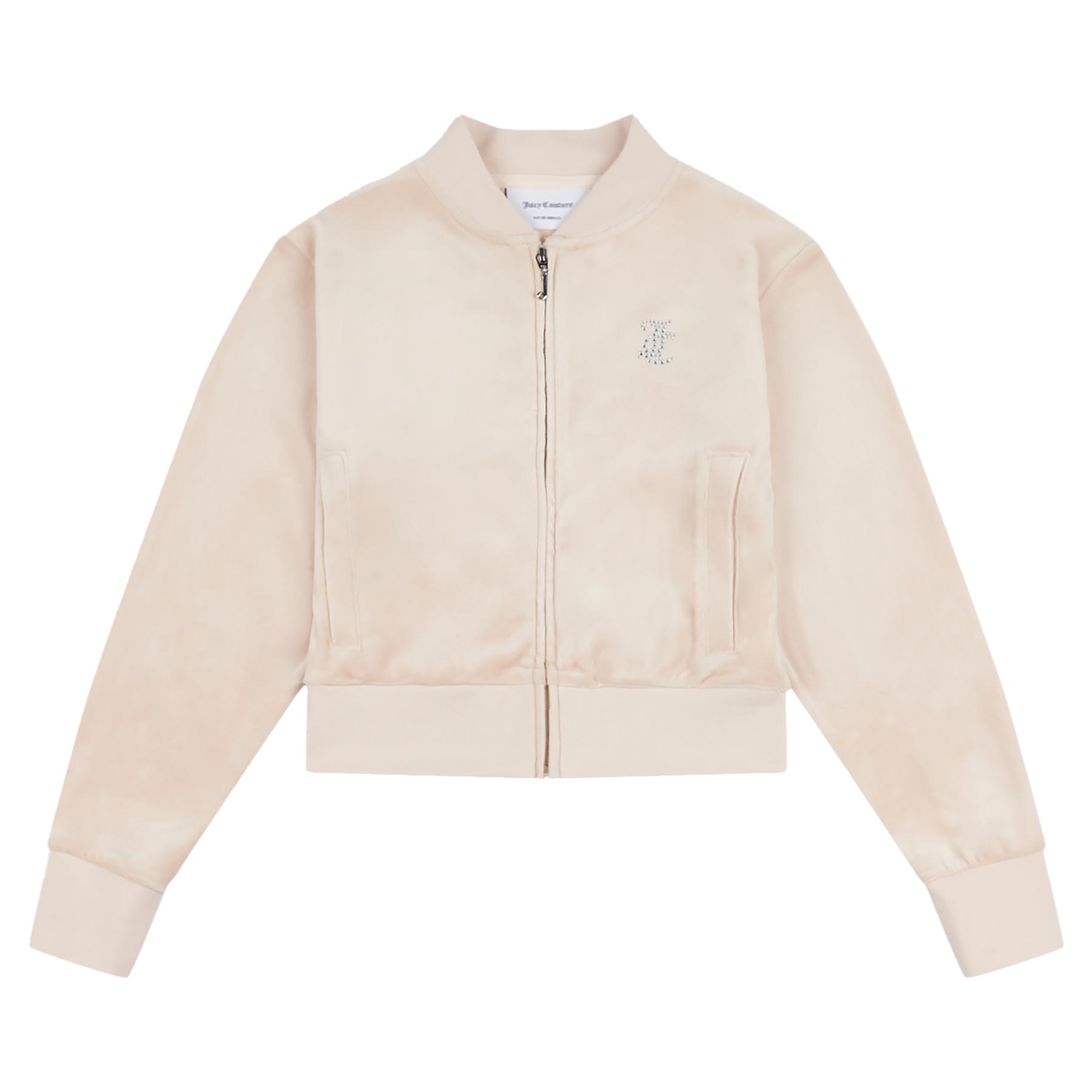 Juicy Couture girls zip though cropped velour sweater.  Super soft stretchy velour sweater with diamante Juicy logo on the chest, and diamante Juicy Couture arch logo across the shoulders at the back, front zipper with silver metal 'J' pull and side pockets. Ribbed jersey cuffs and waistband.   So comfortable to wear and looks amazing on.  Other colours available. Matching shorts, joggers and cargo pants available.